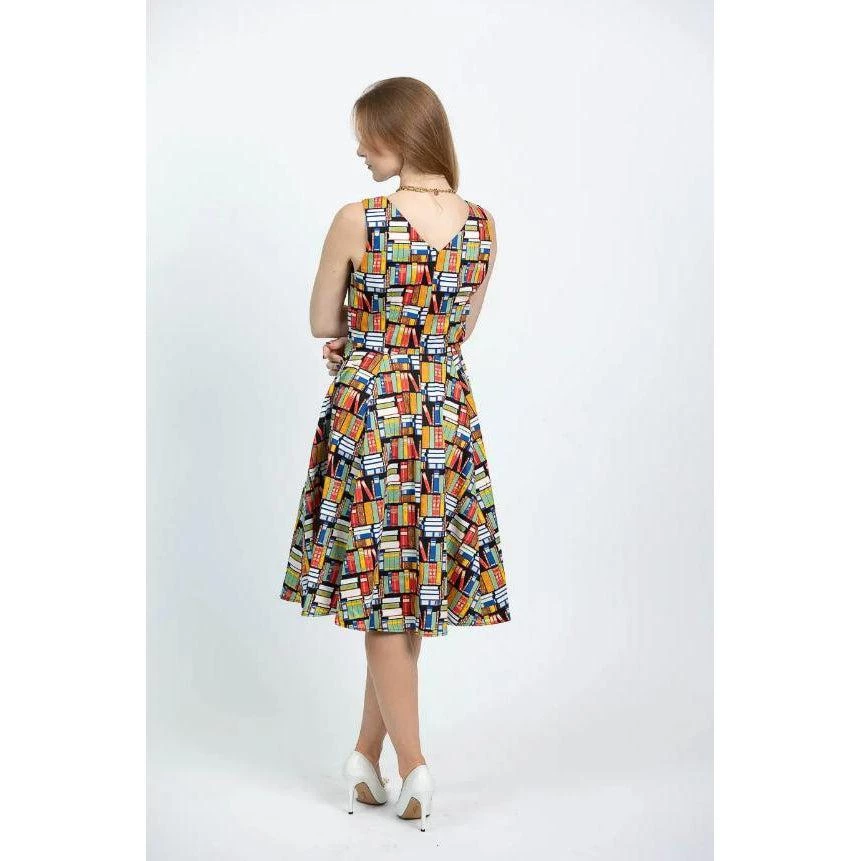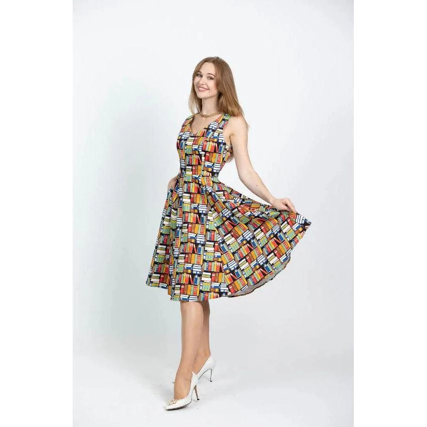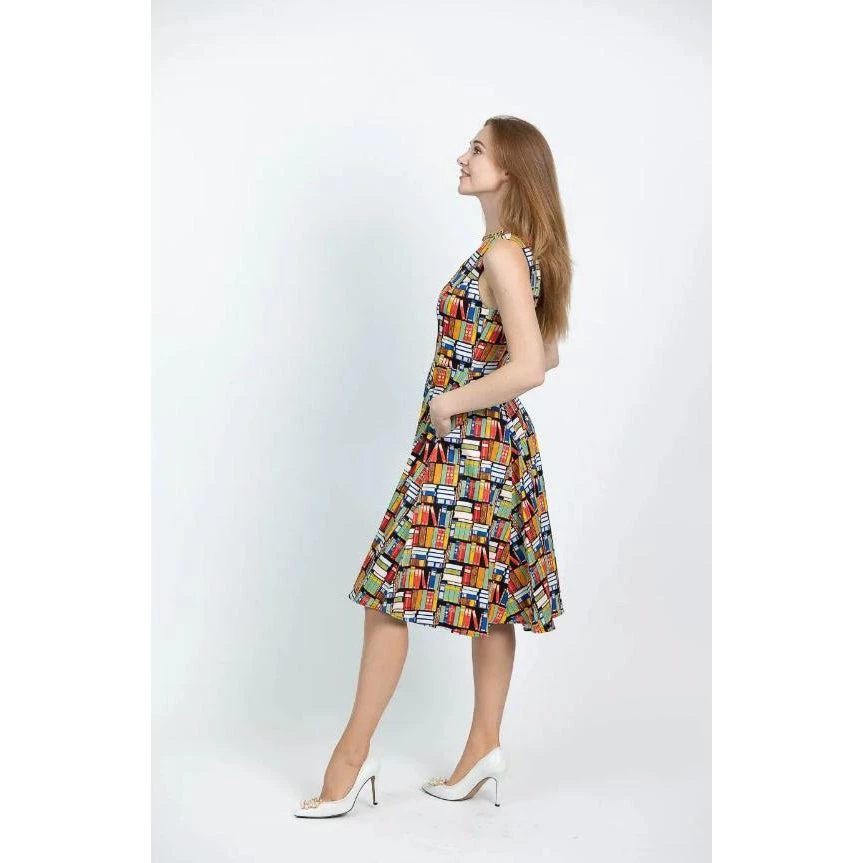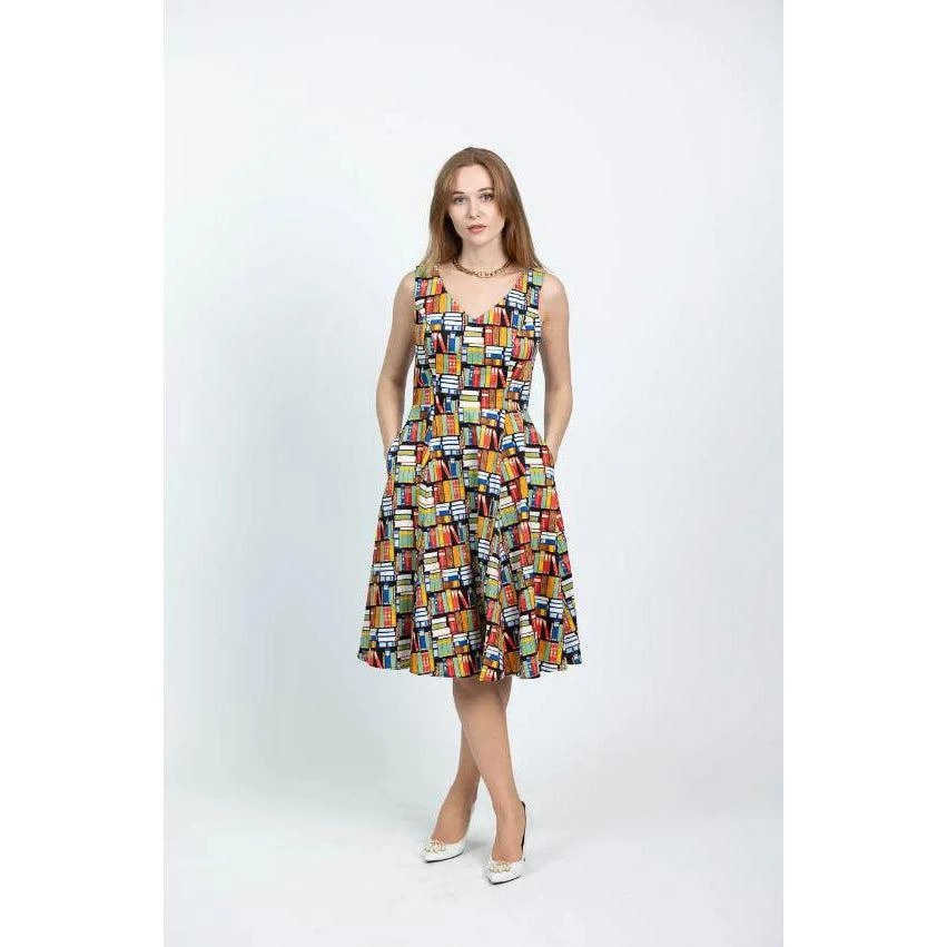 Your summer reading will be a breeze in his gorgeous swing dress from Eva Rose! Made of a supple and sturdy fabric with stacks and stacks of books printed on a black background, the sleeveless dress has very flattering lines with princess seams in the bodice, a V-neckline, and a very full skirt with box pleats that fan out from the center. The high waist seam gives it a very nipped-in look and it has side seam pockets. Zips up the back.