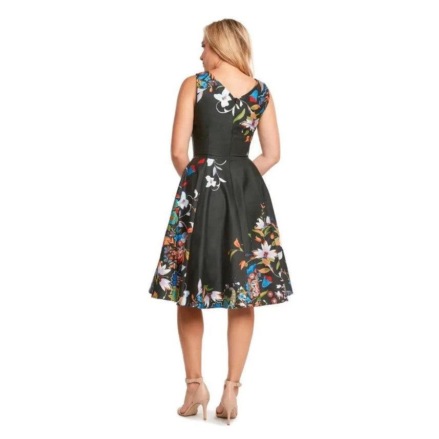 This gorgeous fit-and-flare swing dress from Eva Rose has the feel of an exotic and mysterious garden! Made of a supple and sturdy fabric with beautifully placed florals on a black background, the sleeveless dress has very flattering lines with a V-neckline and a very full skirt. The high waist seam gives it a nipped-in look and it has side seam pockets. Zips up the back.
