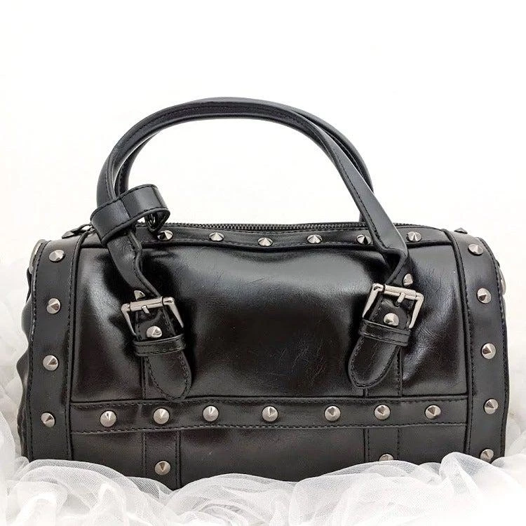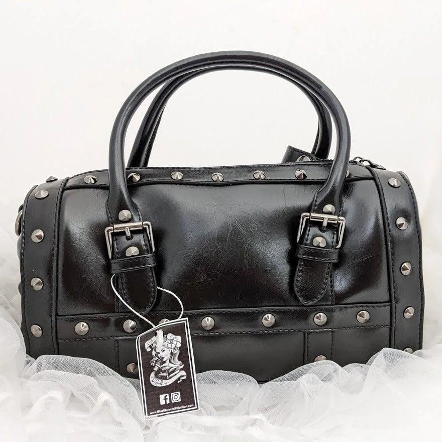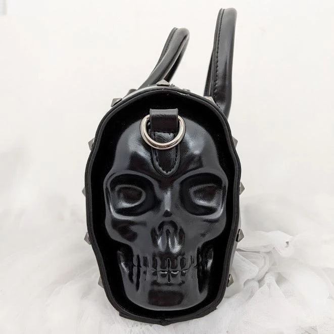 This purse is a gorgeous addition for any rockabilly babe! The skulls on the end are perfection to this studded, vegan leather bag. An innovative extra snap loop attached to the double handles allows you to easily secure them together as one. The interior features three pockets (one zip, 2 open), and a gorgeous scrollwork skull print lining in black and white. Removable shoulder strap included. Geometric skull zipper pull, purse feet at bottom for protection.