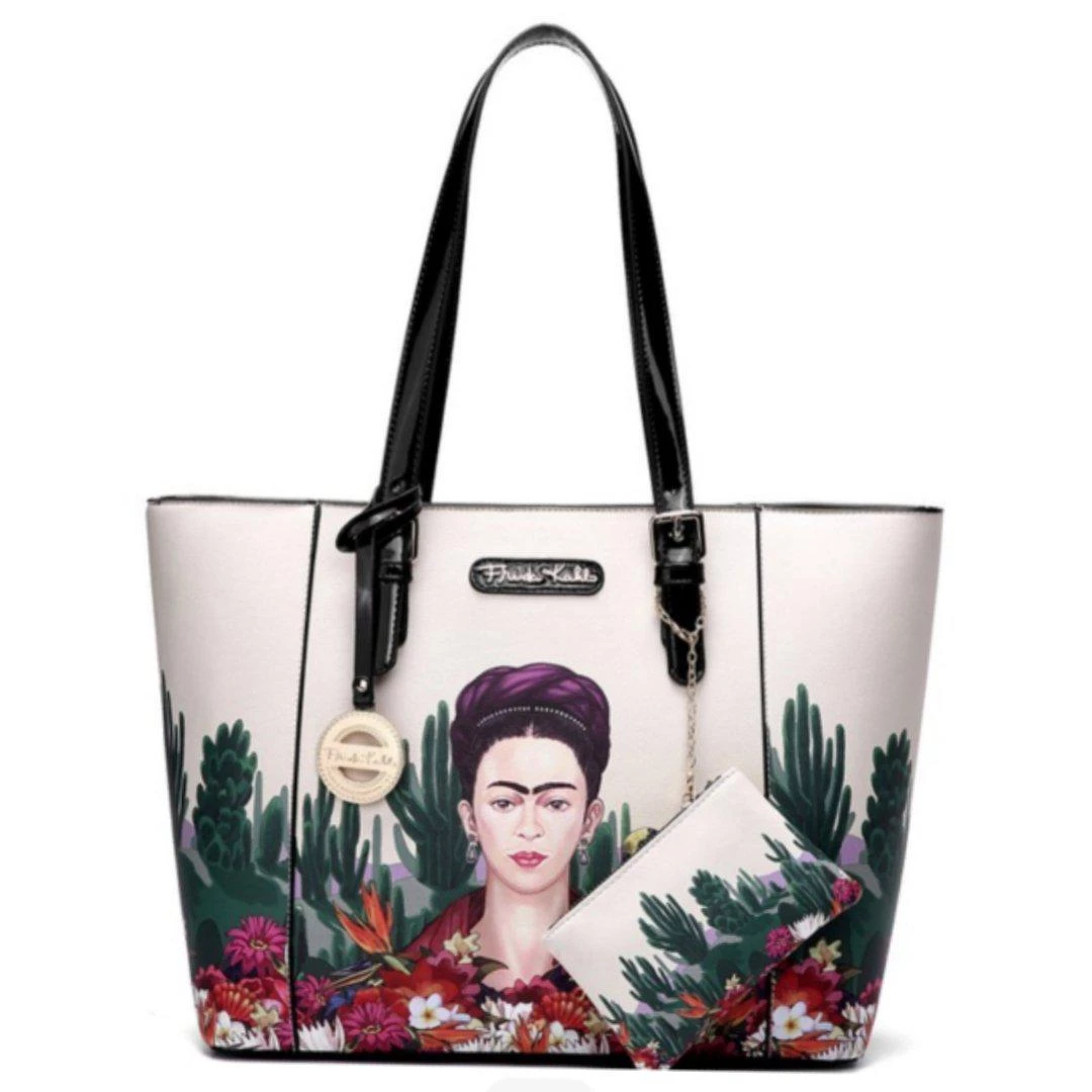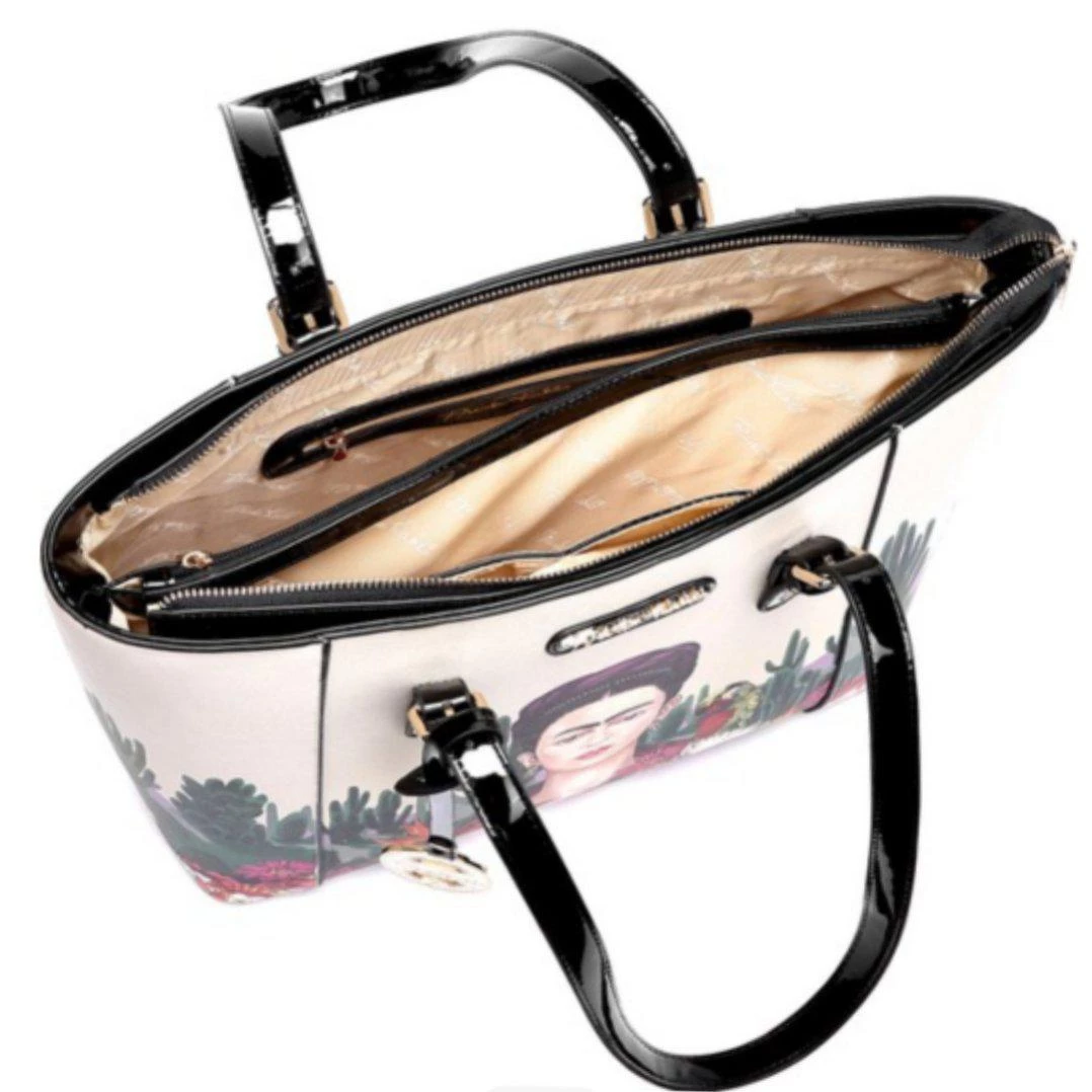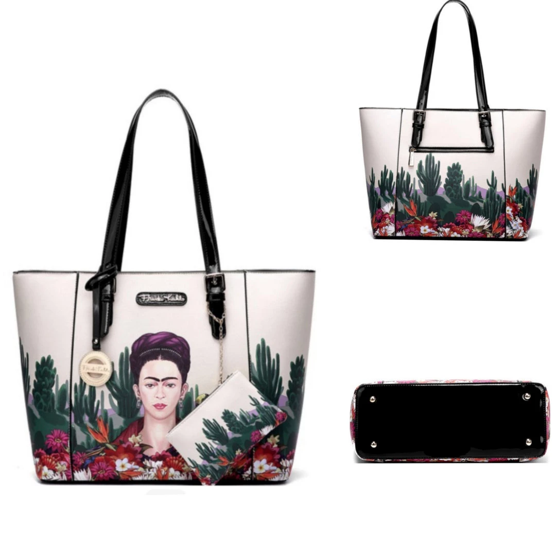 This astonishingly beautiful handbag is adorned with desert-themed artwork inspired by the works of Frida Kahlo, featuring colorful flowers, a wise bird, and an interesting cactus assortment. A glossy black plaque bears the artist’s signature in gold. Two interior pouches provide plenty of room for organizing all of your necessities. The bag zips completely closed at top to keep your treasures safe. Vegan leather; includes matching coin purse.