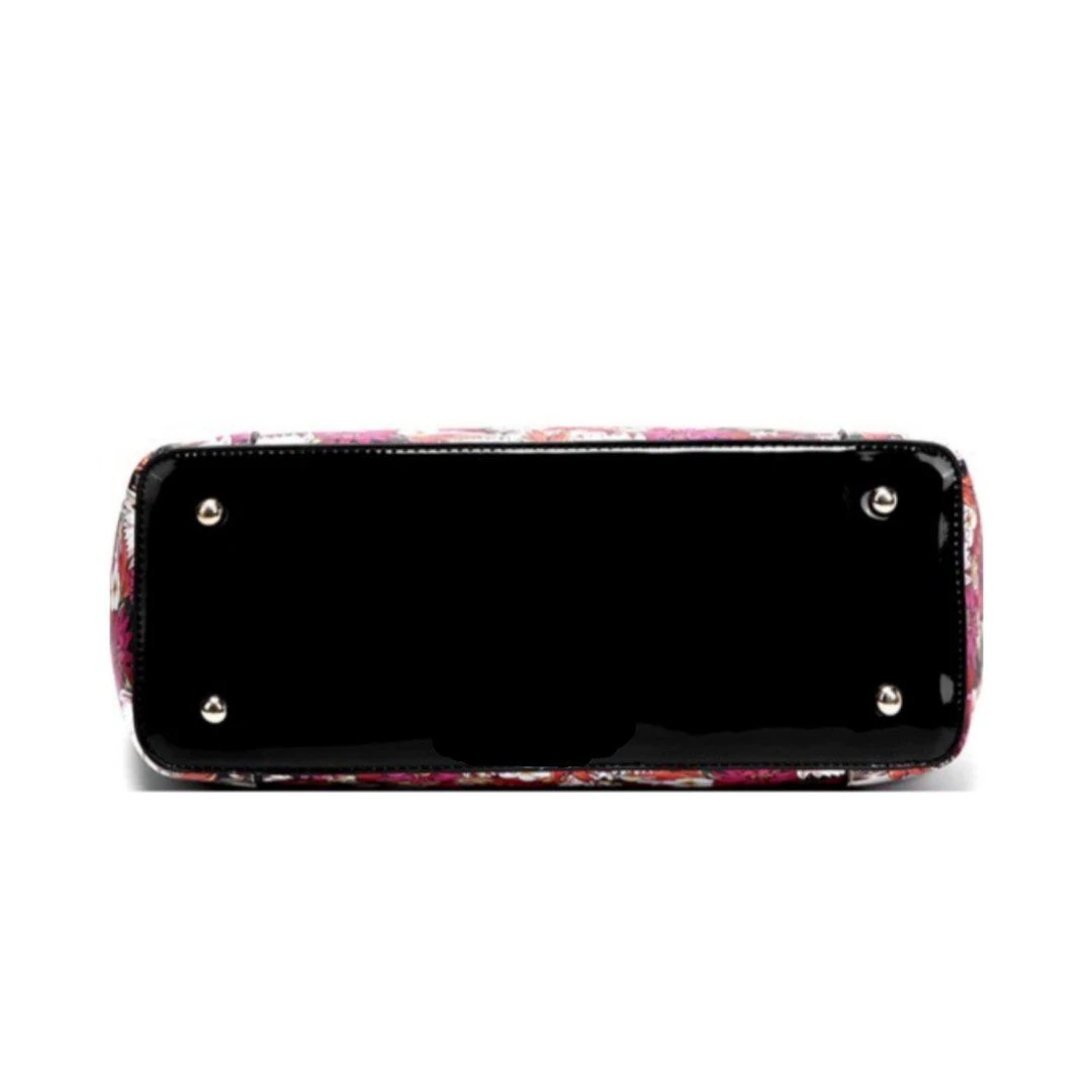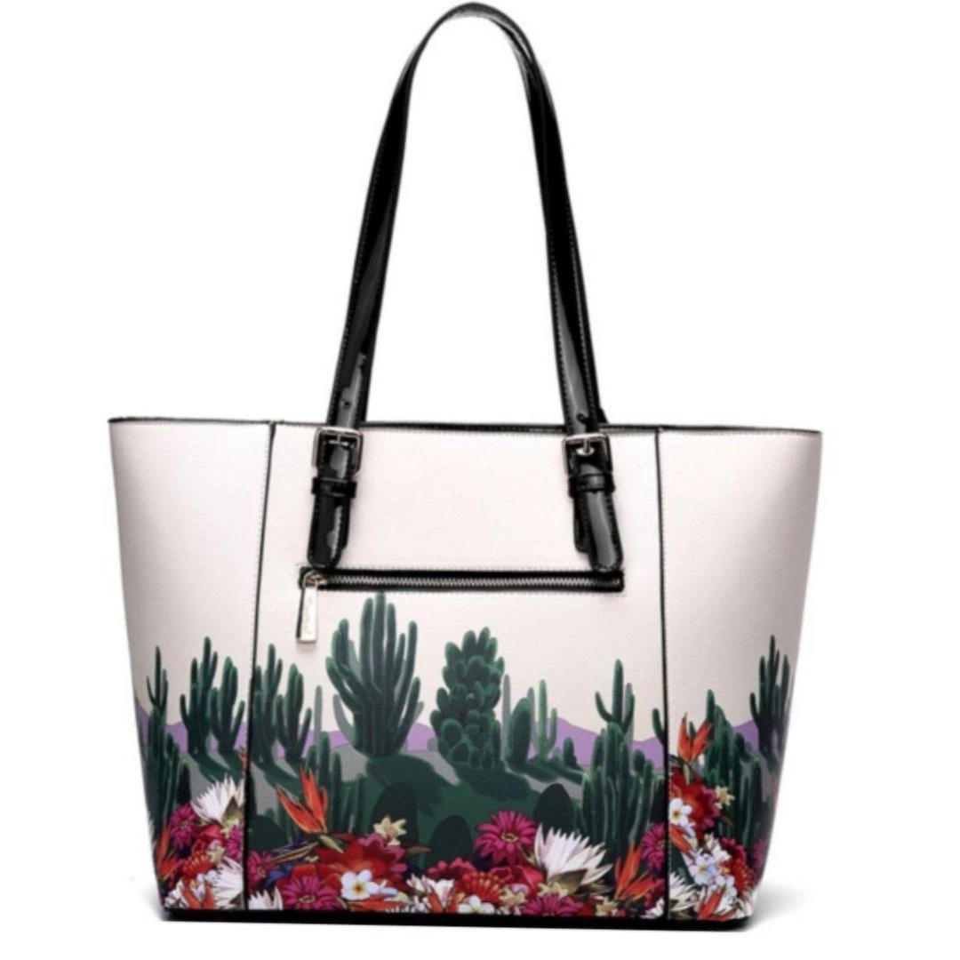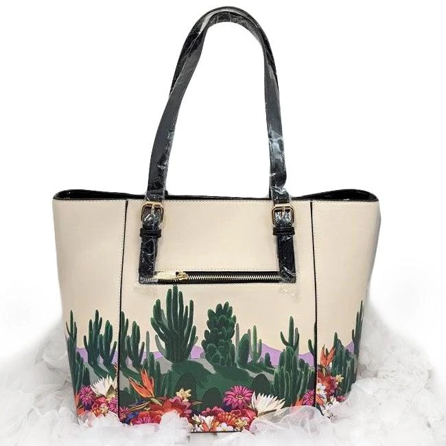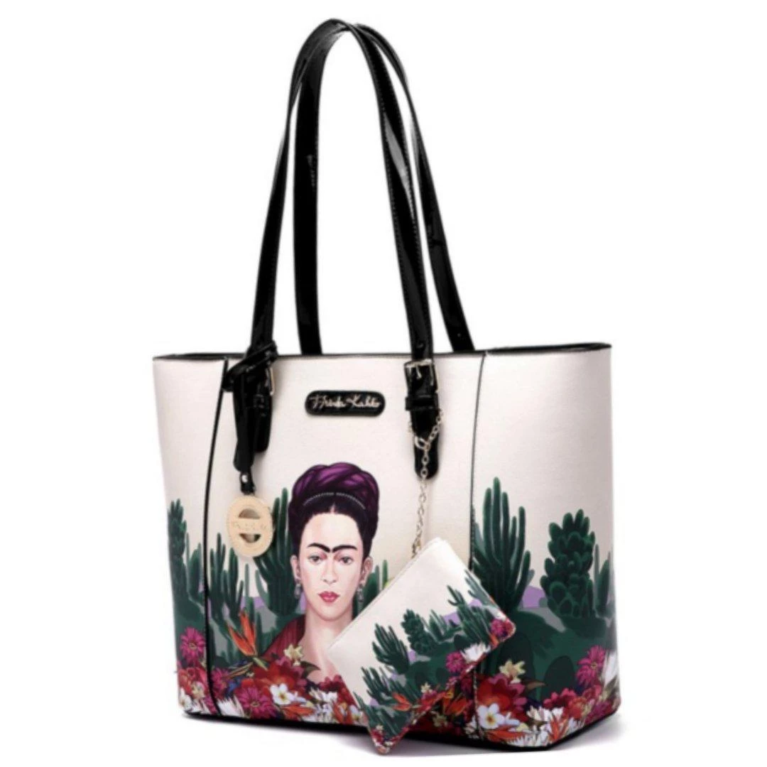 This astonishingly beautiful handbag is adorned with desert-themed artwork inspired by the works of Frida Kahlo, featuring colorful flowers, a wise bird, and an interesting cactus assortment. A glossy black plaque bears the artist’s signature in gold. Two interior pouches provide plenty of room for organizing all of your necessities. The bag zips completely closed at top to keep your treasures safe. Vegan leather; includes matching coin purse.