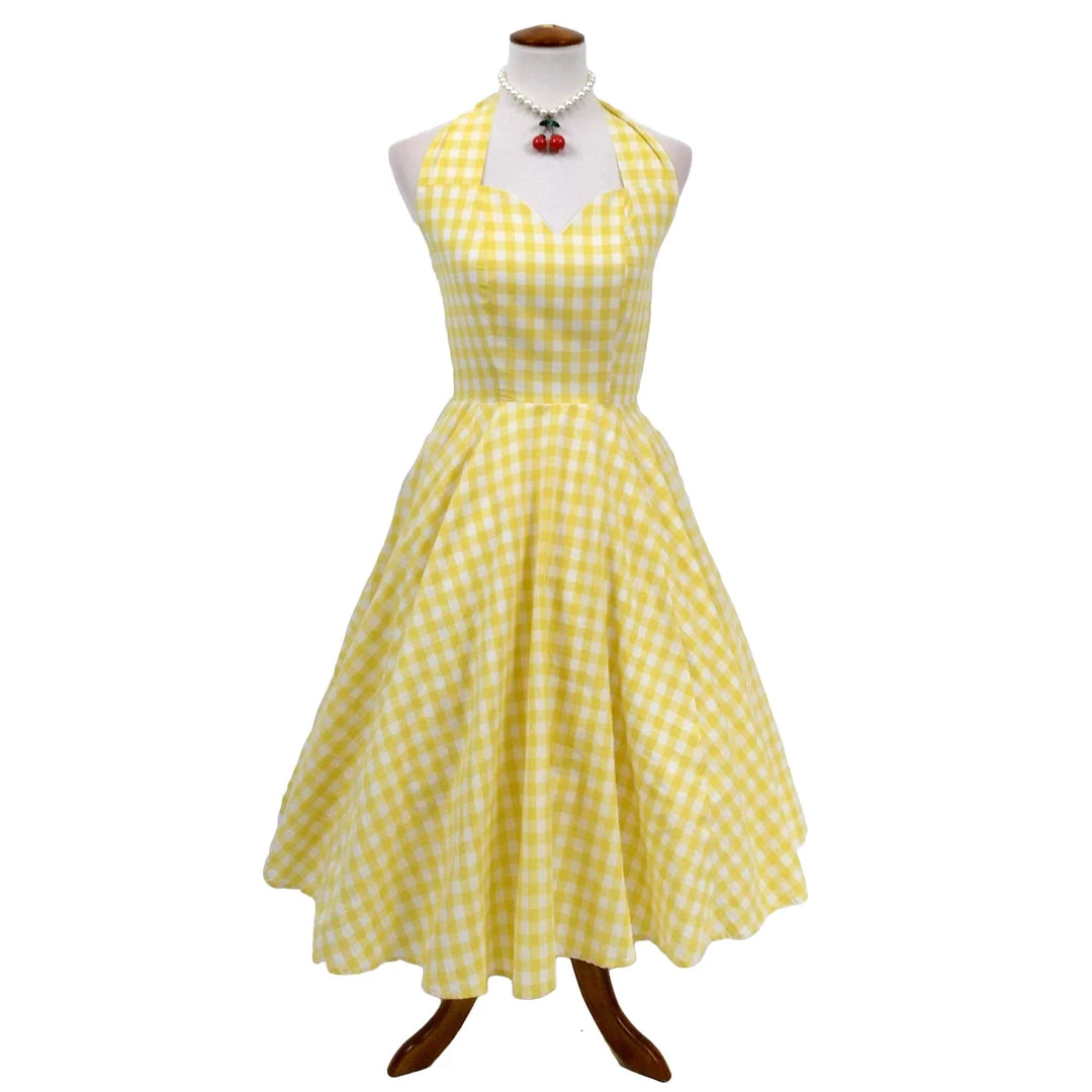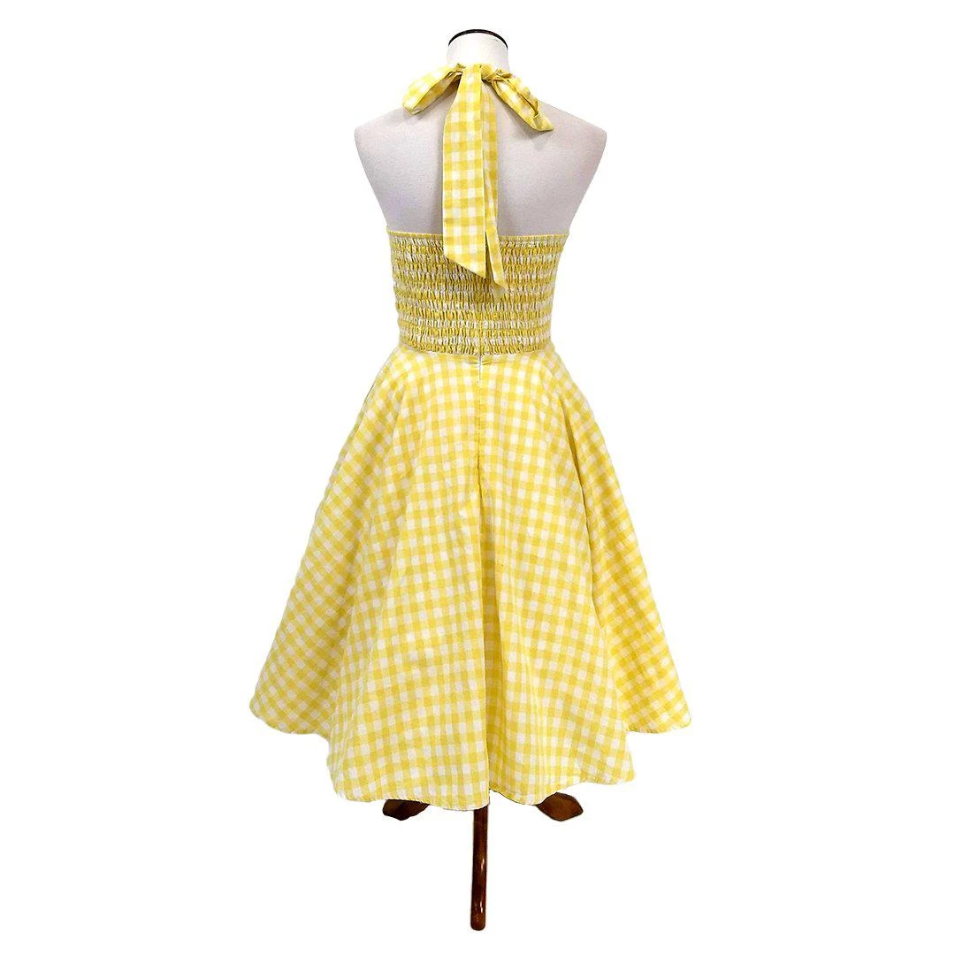 Here comes the sun in GGR’s newest halter dress in yellow gingham!! The lined bodice features a sweetheart neckline and wide halter ties. It zips up the back and has stretch panels for comfort. The lined skirt is a GIANT full circle with deep side seam pockets.Â