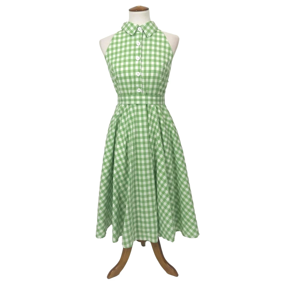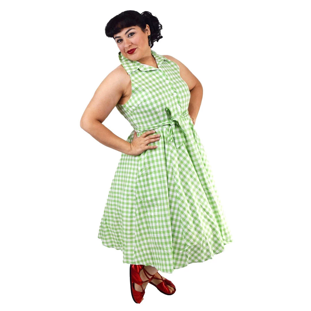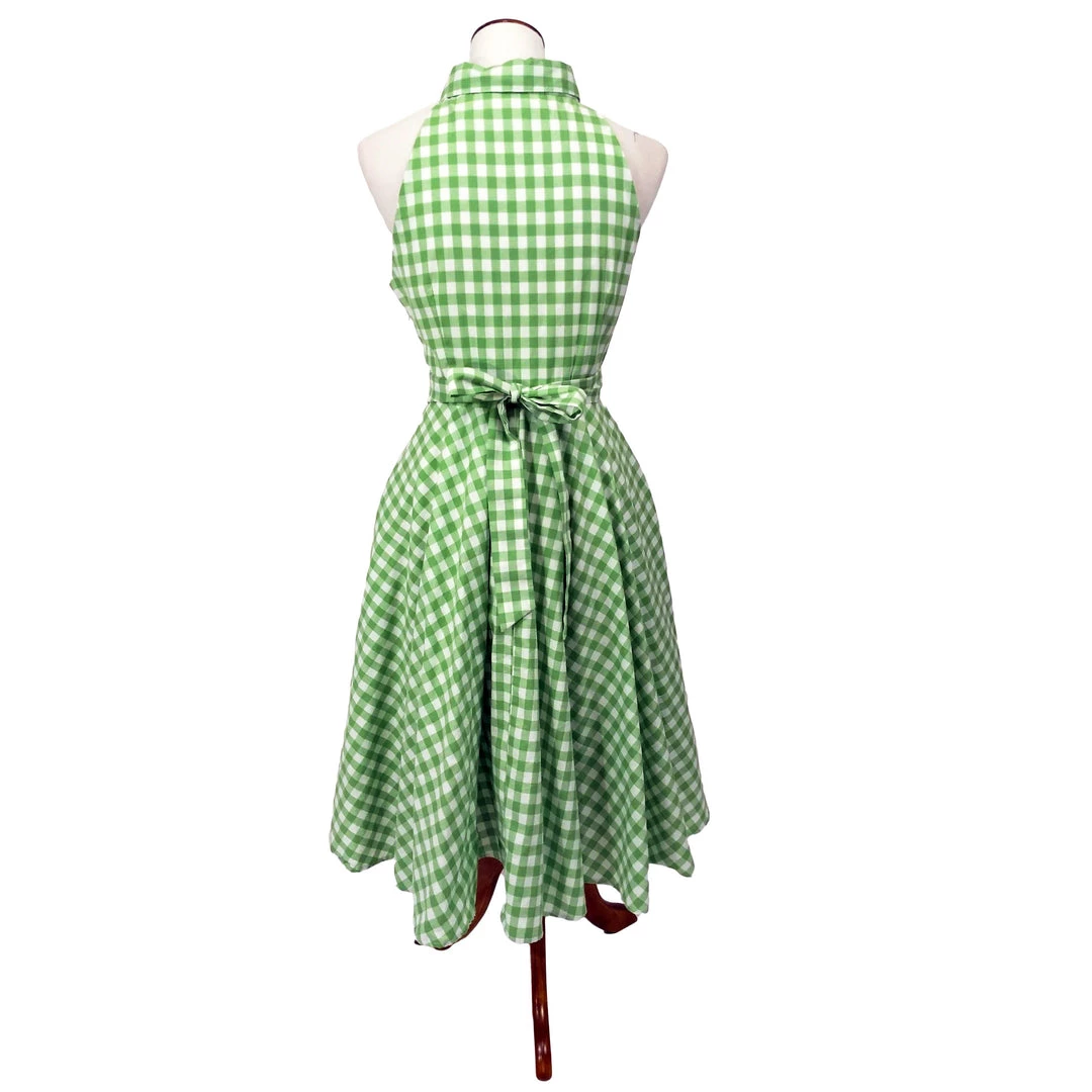 The grass is greener in green gingham from GGR’s Shirtdress line! The “June” is a gorgeous housewife perfection dress that is fully lined, the buttons down the front are functional, and it has a hidden side zipper. The dress has a GIANT full circle skirt with very deep side seam pockets and a nice matching tie belt. The collar is wide and structured so you can pop it up for an extra sexy bit of class and a little sassy feel.