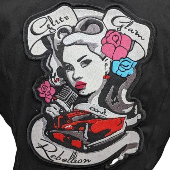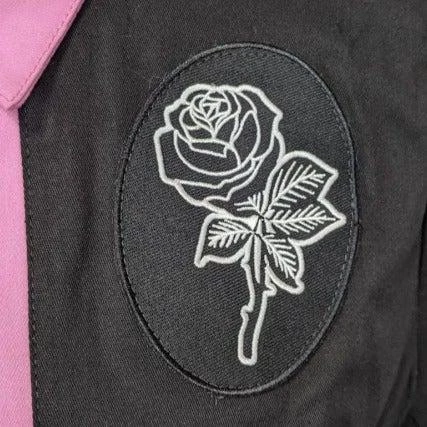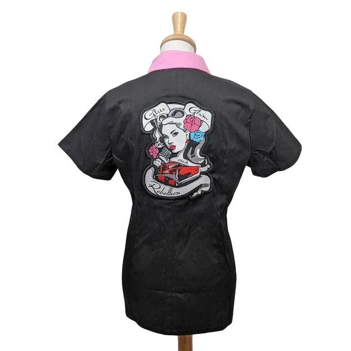 This is GGR’s exclusive bowling shirt with our fabulous logo on the back and our signature rose patches on the front. The short-sleeved shirt is black with a pink collar and pink center-front panel. Made of cool, comfortable cotton this vintage style bowler pairs fabulously with jeans, capris, or cigarette pants for a perfect mid-century modern outfit!