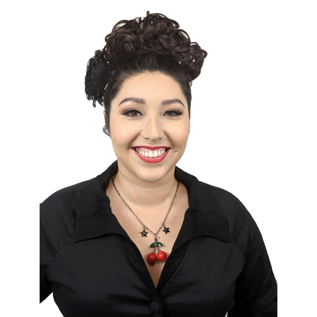 This super fun dark chain necklace features a hanging cherry pendant with green rhinestone leaves dangling from the middle, plus two star charms. The necklace is 23″ in length and adjustable. It’s the perfect finishing touch for your retro & rockabilly looks!