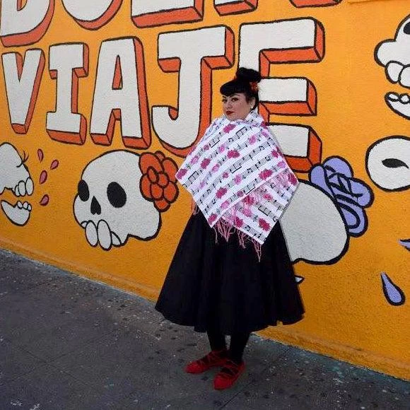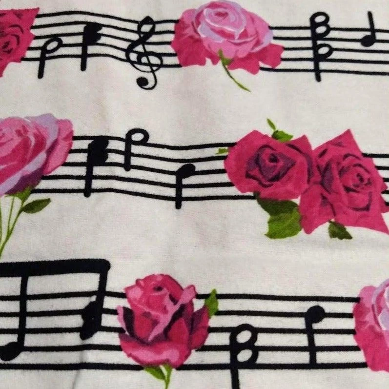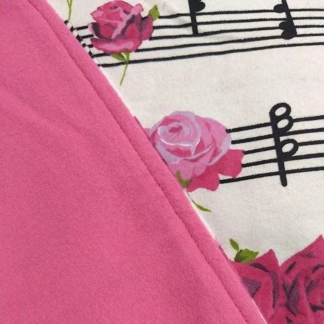 This is an amazing bolero that features roses and music notes. The inside is pink and made out of soft material. It also features a matching pink fringe. What a fashionable way to keep warm!