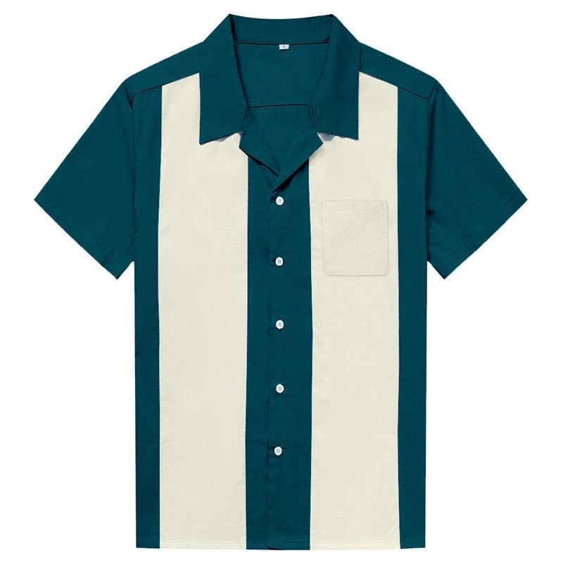 This is a classic men’s bowler in a deep, dark turquoise with double front panels in cream/white and a left chest pocket. Cool cat daddy!
