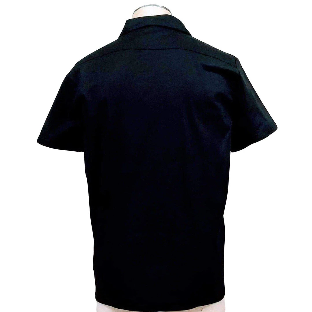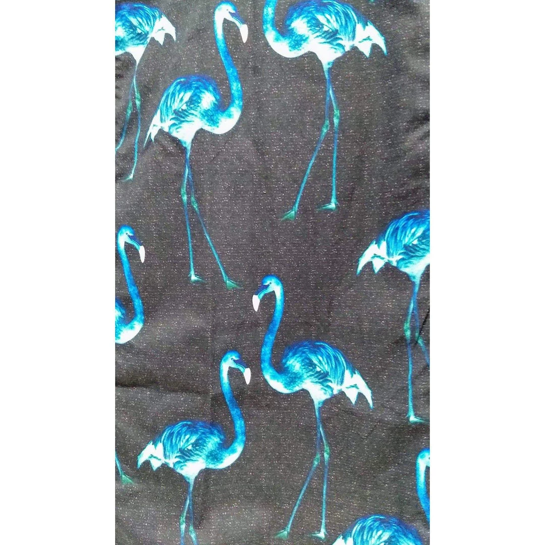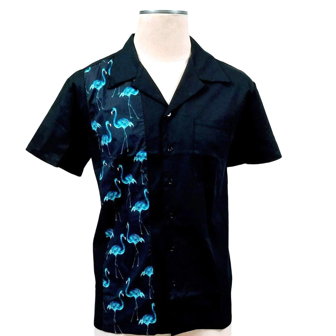 This is a classic men’s bowler in black with a wonderful front panel featuring blue flamingos. Single breast pocket. Tantalizing tiki room attire!