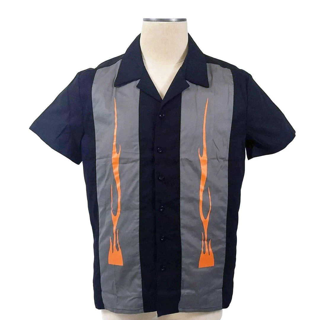 This classic men’s bowler is hot-cha!! Black with double front panels in gray with bright orange flames rising from the bottom to the top. No pocket.Â