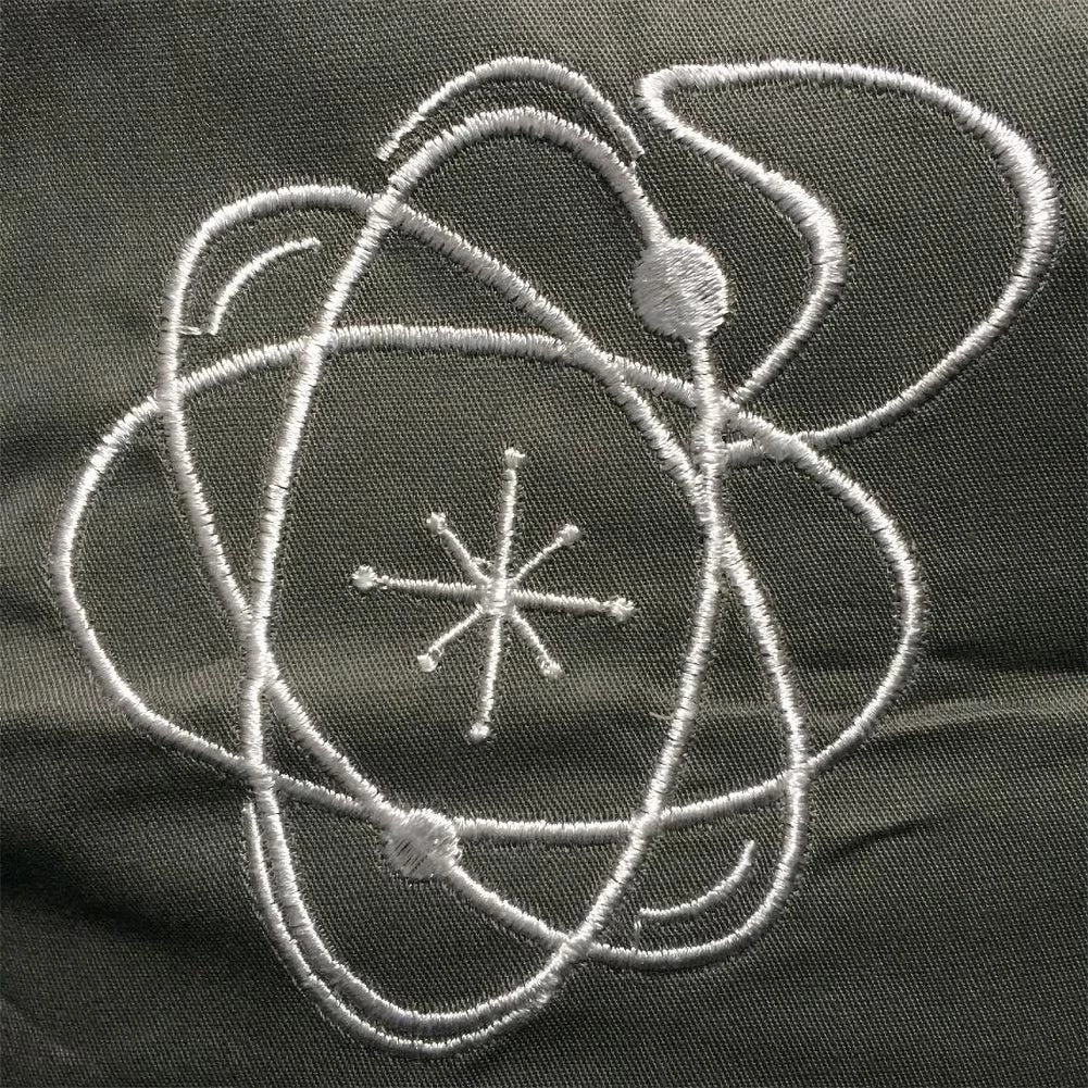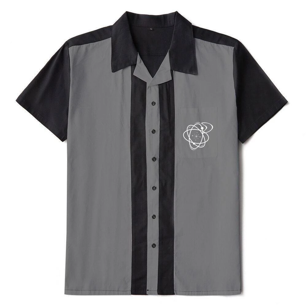 This classic bowler shirt is black and gray and features an embroidered atomic symbol in white. There is no pocket.