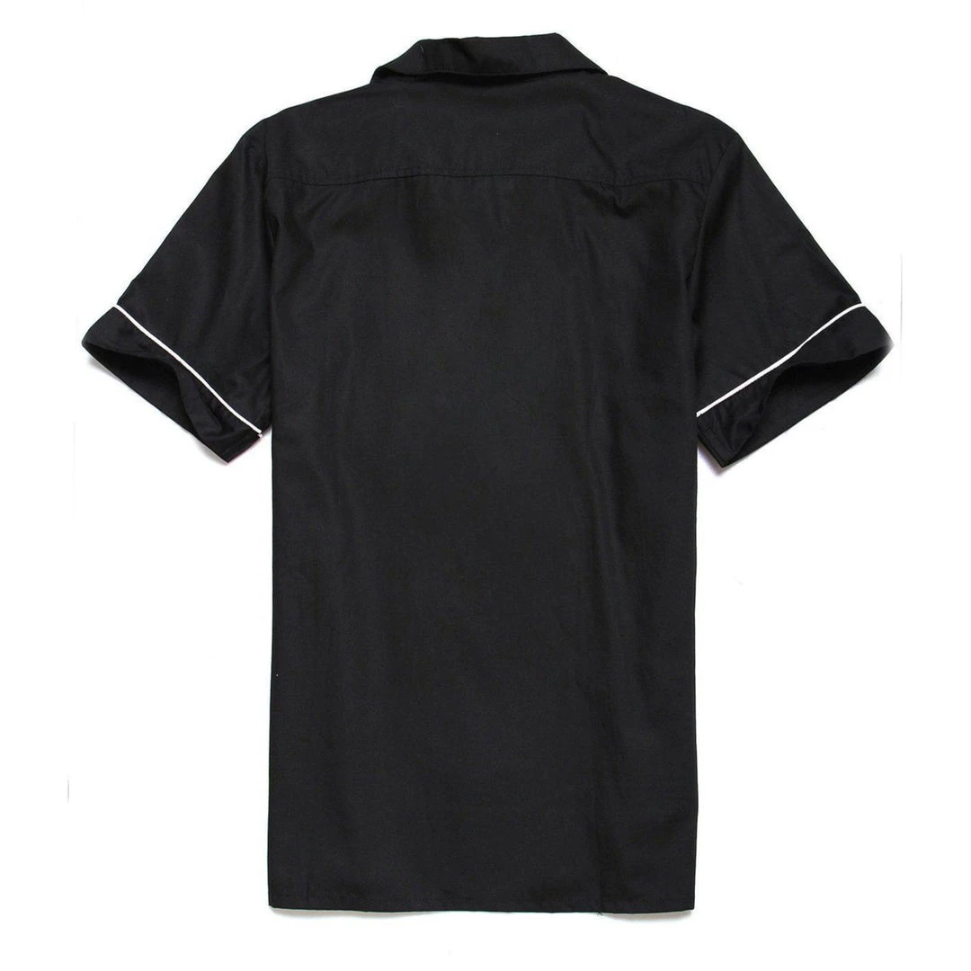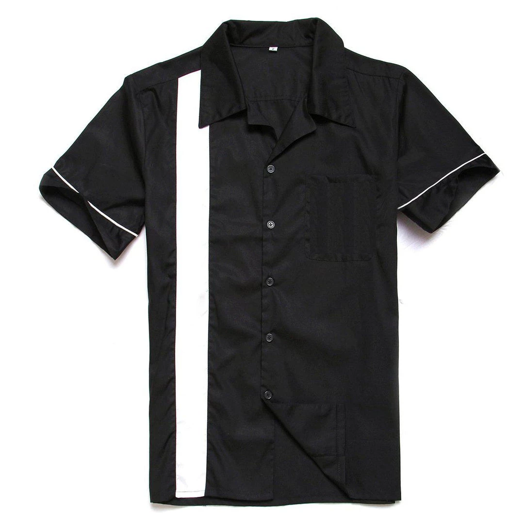 This is a classic bowler shirt that features a thin white panel and a breast pocket. It also features white accent stripes around the sleeves.Â