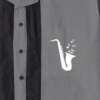 This classic bowler shirt is gray and features black accents with a white saxophone embroidered onto the breast pocket.