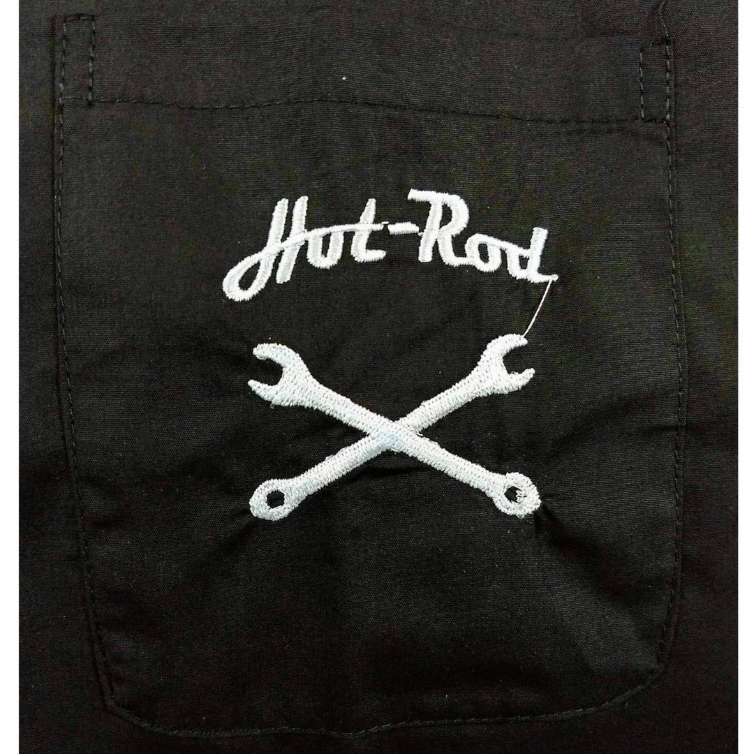 This is a classic men’s bowler in black with white accents. There’s a thin white front panel, white sleeve piping, and white embroidery featuring wrenches and the words “Hot-Rod” on the single breast pocket. Perfect for hot dudes in their classic cars!