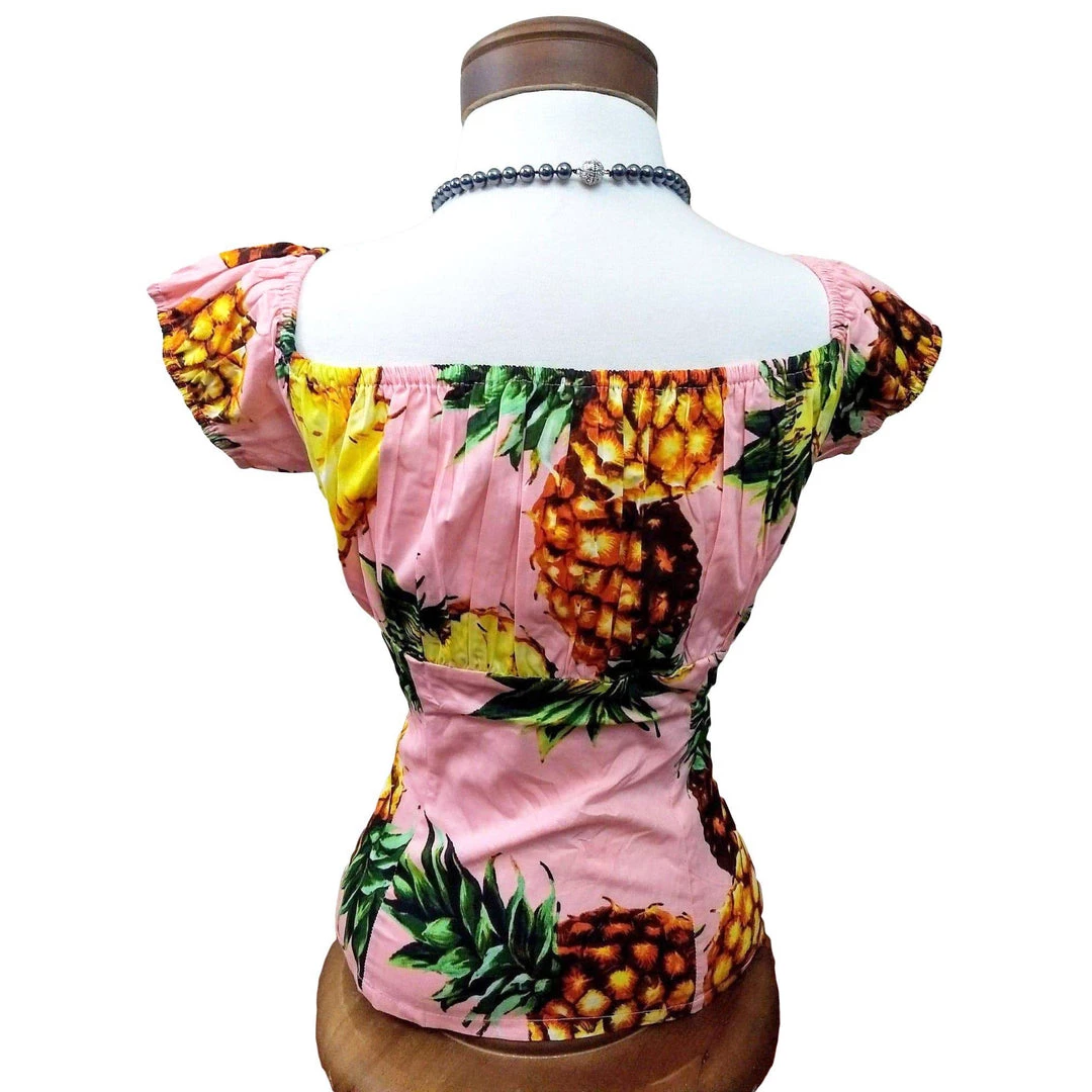 A peasant blouse is a PERFECT addition to any pinup outfit with its simple, classy look. Pair it with your favorite capris, pedal pushers, or circle skirt for a romantic retro look. It can be worn on- or off-the-shoulder. Zips on the side for easy on and off. Pretty in pink and pineapples!