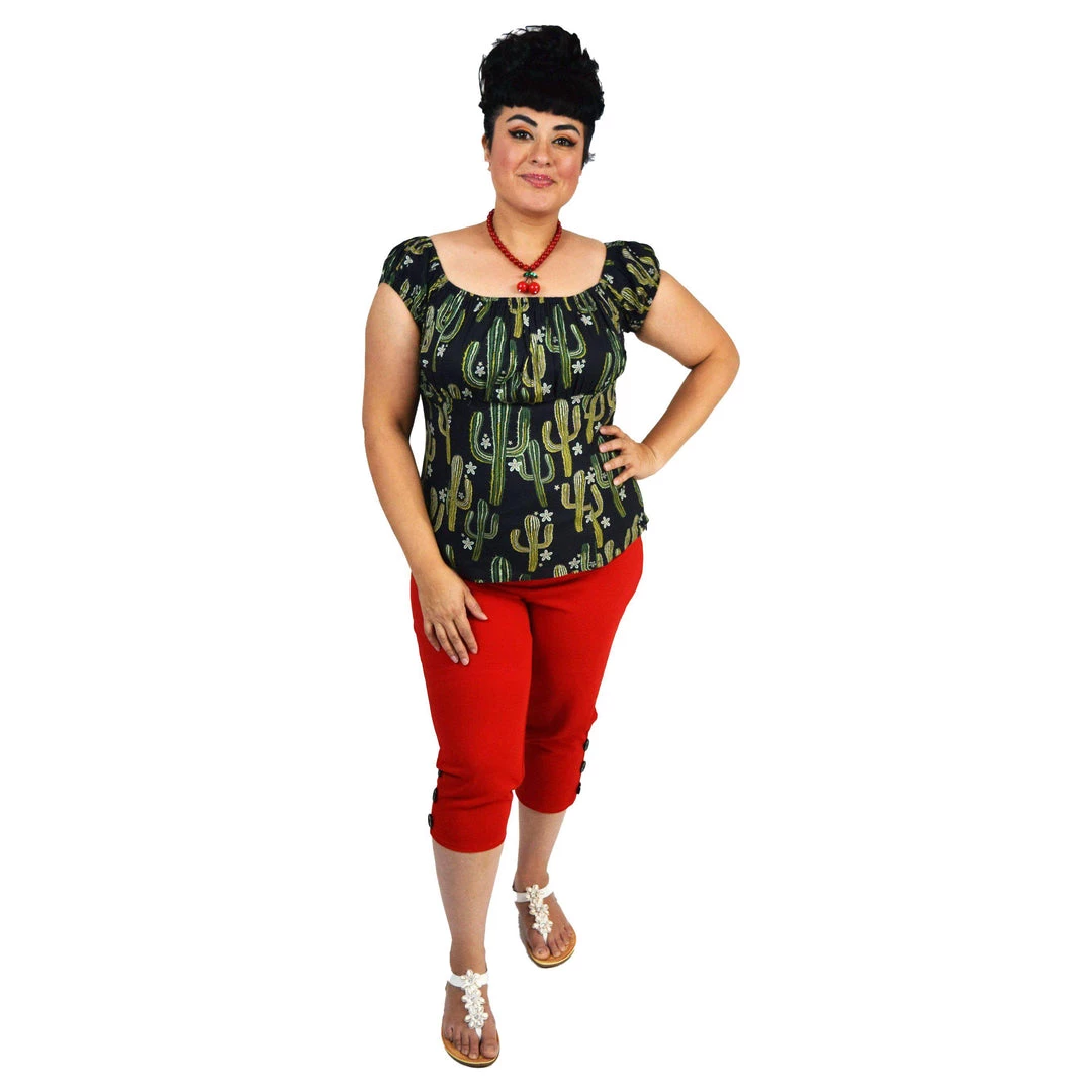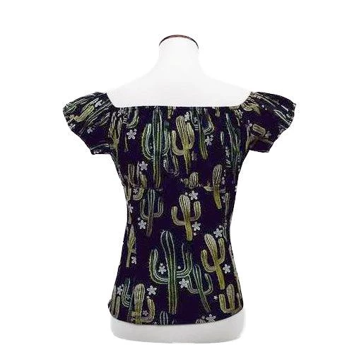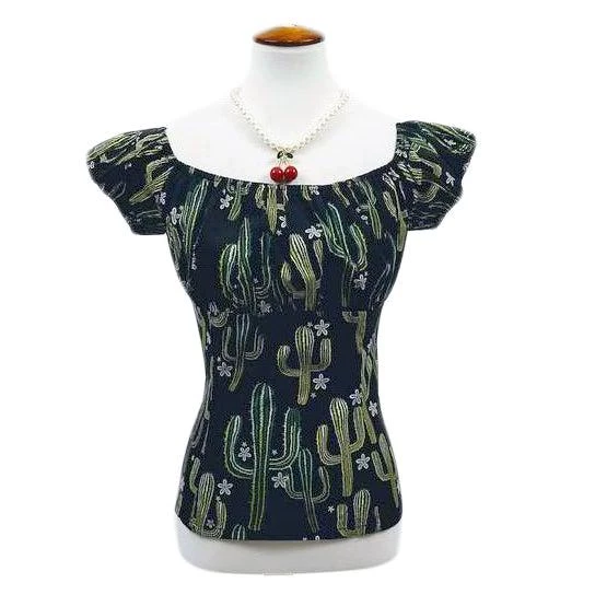 A peasant blouse is the PERFECT addition any pinup outfit with its simple, classy look. Pair it with your favorite capris, pedal pushers, or circle skirt for a romantic retro look. You can watch them get all prickly wearing this rowdy cactus print!