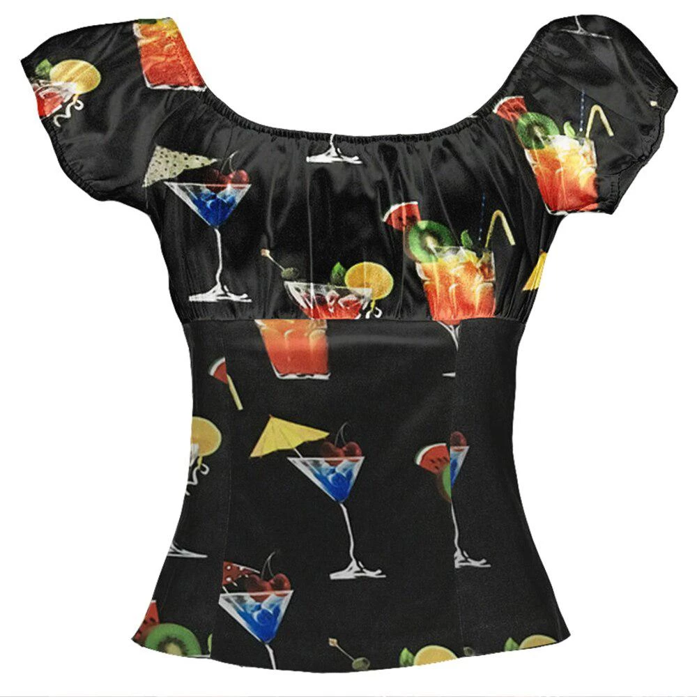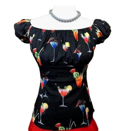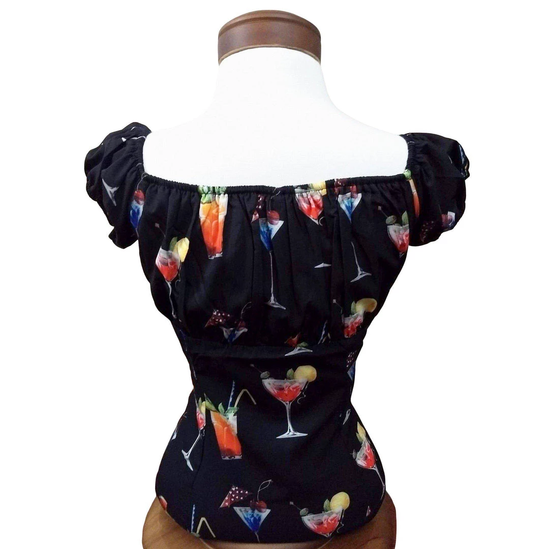 It’s five o’clock somewhere!! So put on the PERFECT addition to any pinup outfit in this cocktail print peasant top. With its simple, classy look you can pair it with your favorite capris, pedal pushers, or circle skirt for a romantic retro look. Umbrella for your drink, dahling?