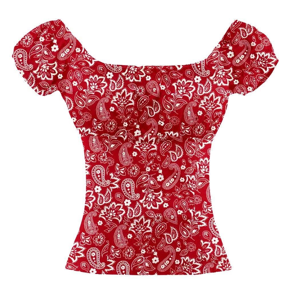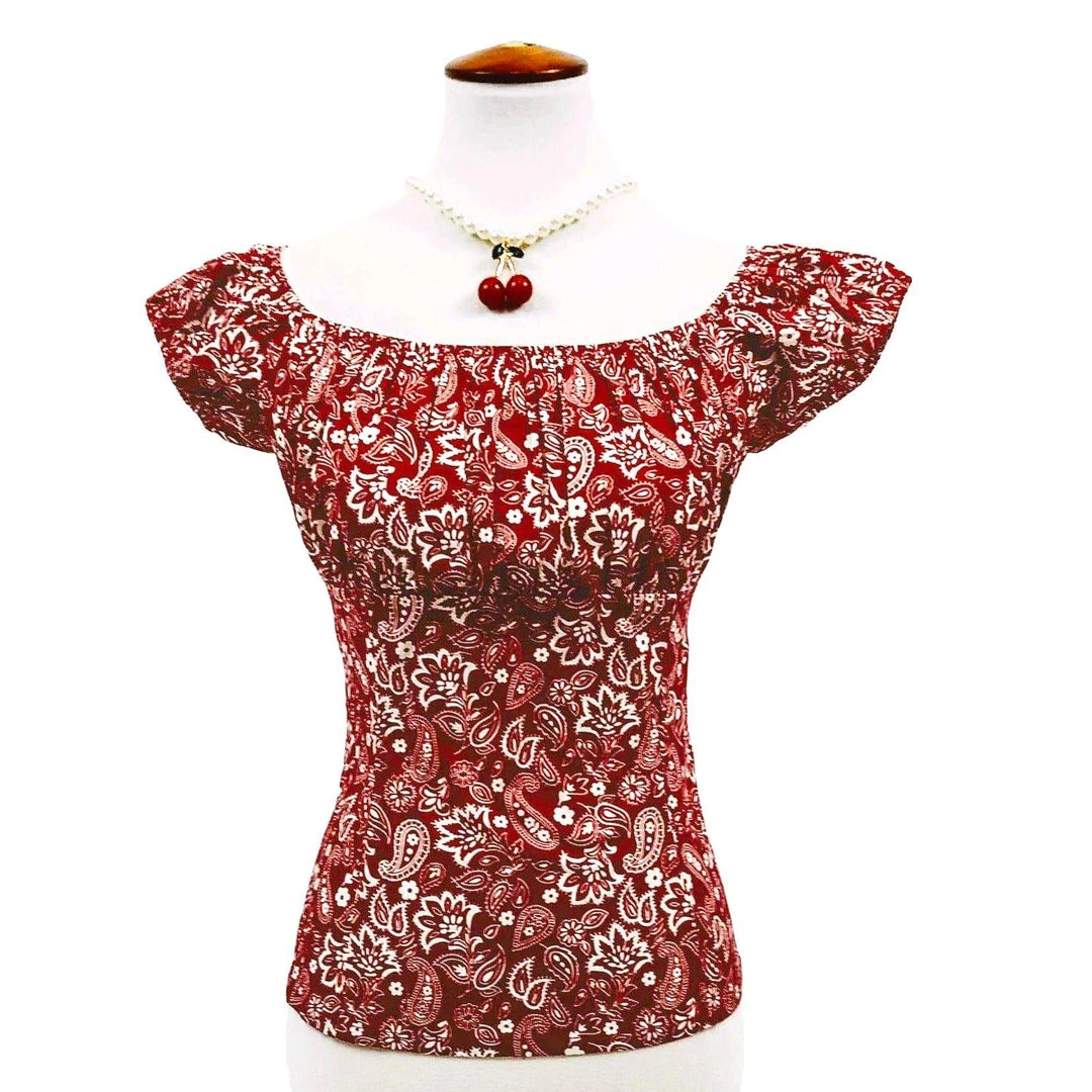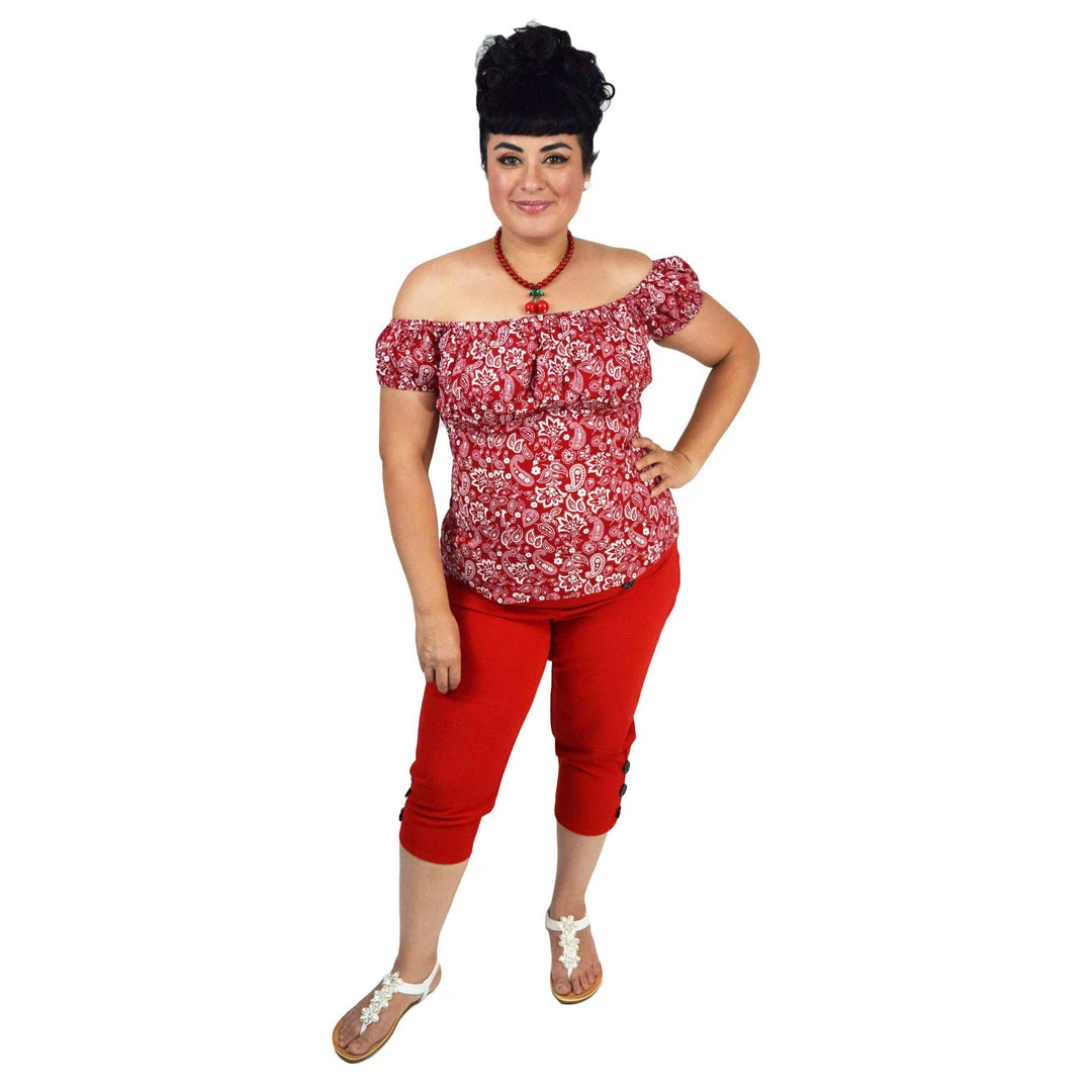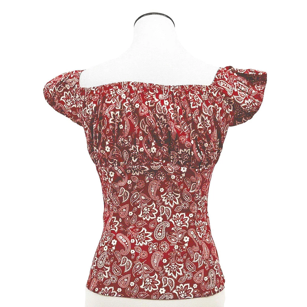 A peasant blouse is the PERFECT addition to any pinup outfit with its simple, classy look. Pair it with your favorite capris, pedal pushers, or circle skirt for a romantic retro look. Pretty paisley kerchief print in red and white.