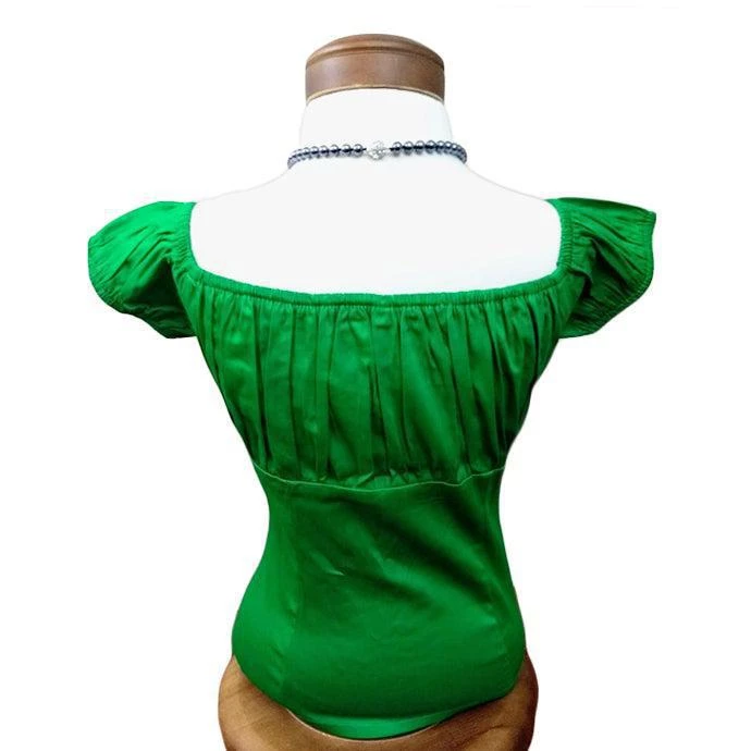 A peasant blouse is the PERFECT addition to any pinup outfit with its simple, classy look. Pair it with your favorite capris, pedal pushers, or circle skirt for a romantic retro look. Can be worn on- or off-the-shoulders. Zips on the side for easy on and off. Emerald green.