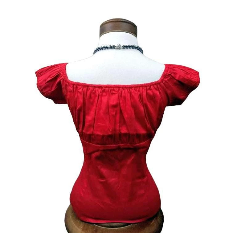 A peasant blouse is the PERFECT addition to any pinup outfit with its simple, classy look. Pair it with your favorite capris, pedal pushers, or circle skirt for a romantic retro look. It can be worn on- or off-the-shoulder. Zips on the side for easy on and off. Lipstick red.