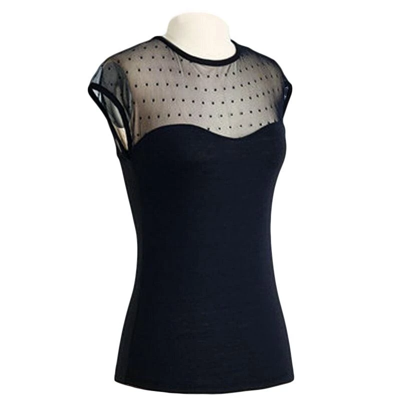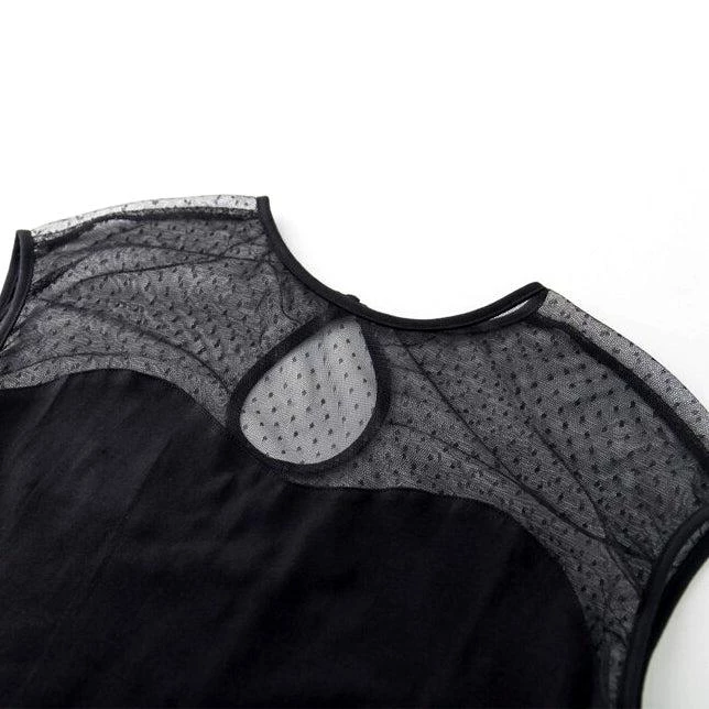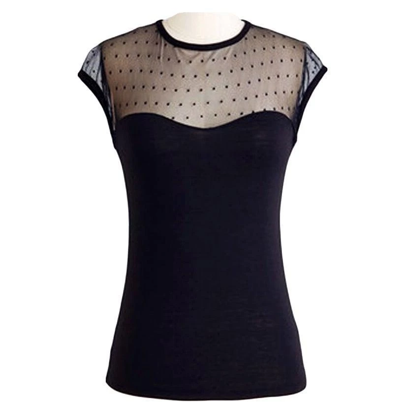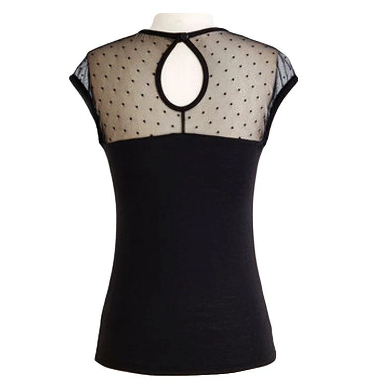 This black mesh pinup top is perfect to dress up or down any outfit. It features a mesh top with black dots and a solid black bodice. Pair it with your favorite capris, pedal pushers, or circle skirt for a romantic retro look.