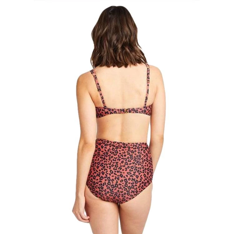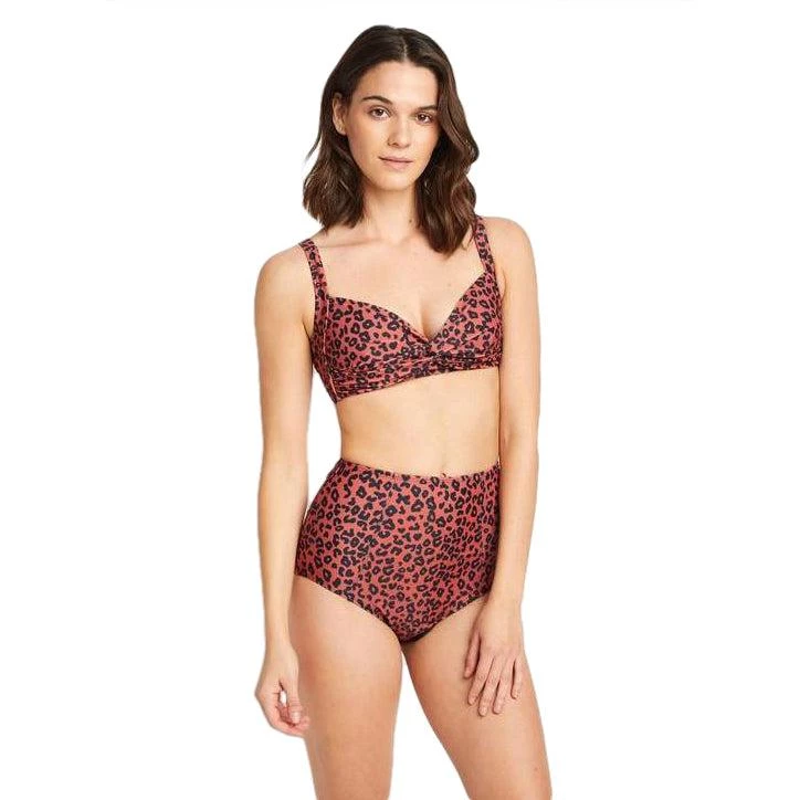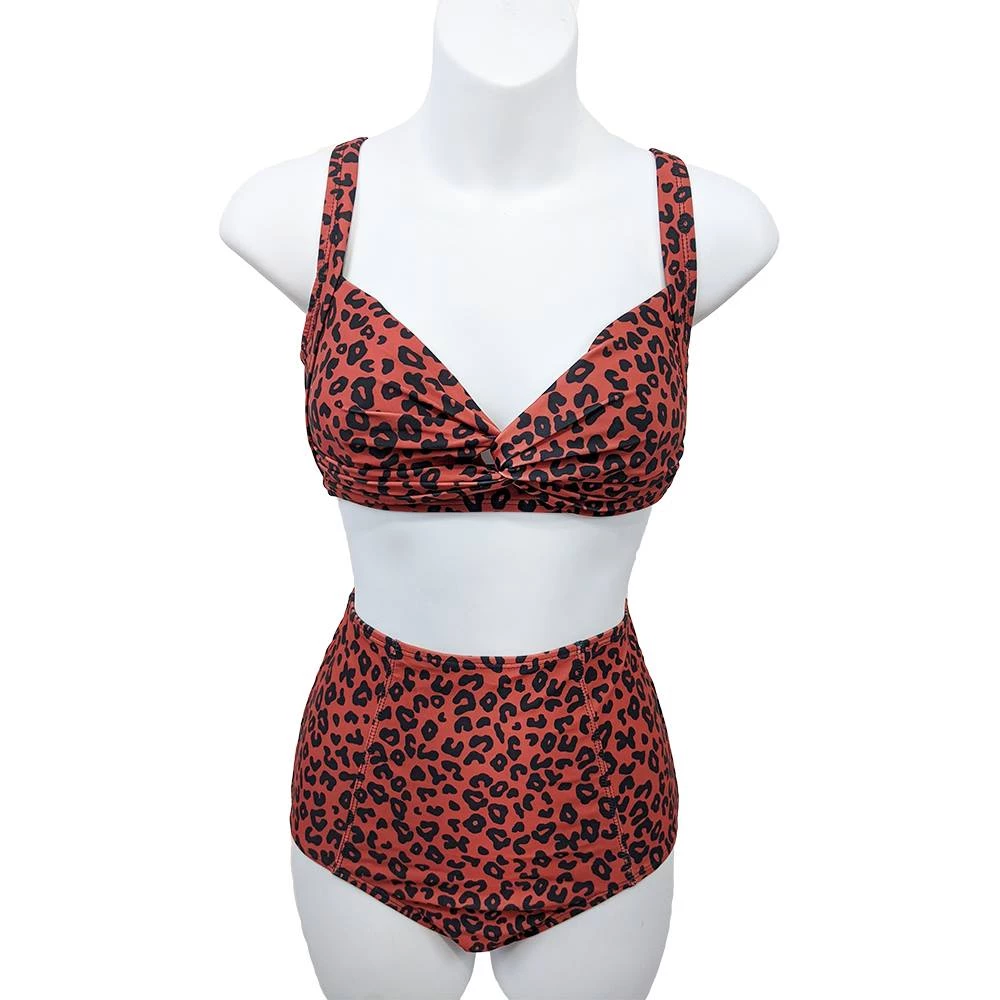 Feel fabulous and channel your inner Bettie Page in this gorgeous leopard print swimwear. This two-piece features a leopard print top and bottom with a retro look. The straps to the top are fully adjustable and the bust is twisted together for an extra fun accent in the front. The high waist bottoms on this gorgeous set bring the look together for a fun-filled, retro summer of swim!