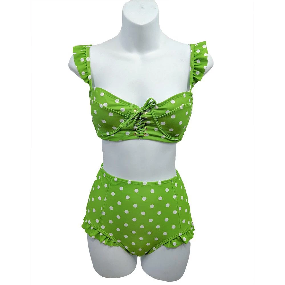 Adorably vintage and ready for the beach. This two-piece features a lime green and white polka dot top with an adjustable tie front and adjustable ruffled straps with a high waist bottom. The bottoms are accented with a subtle ruffle across the top of the thigh to match the top straps.