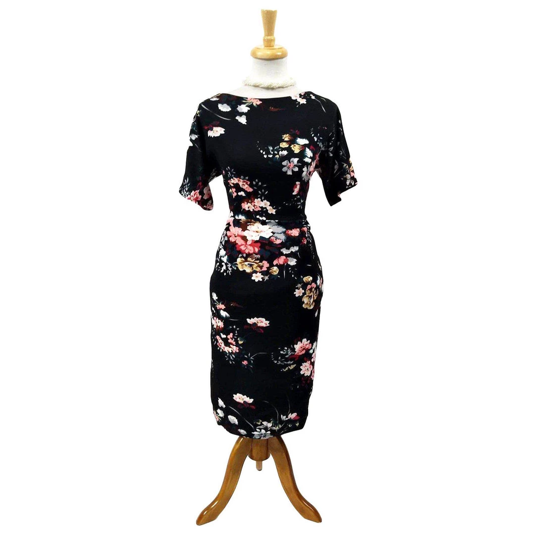 This wiggle dress is a soft jersey knit feel. It features a colorful floral print in white, pink, teal, brown, and yellow on a black canvas, a round neck, short sleeves, and lovely deep pockets. Zips up the back. Perfect for office, cocktails, or date nights.