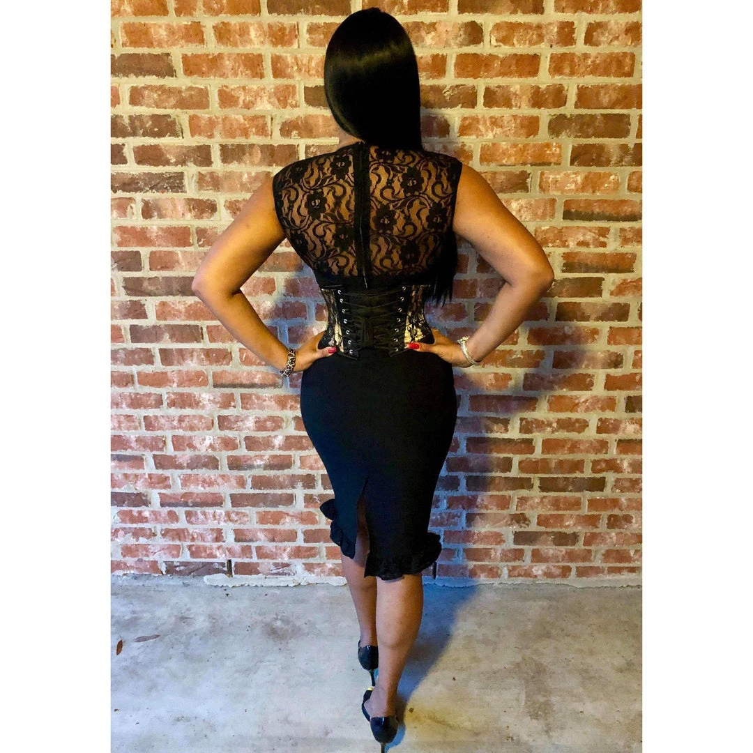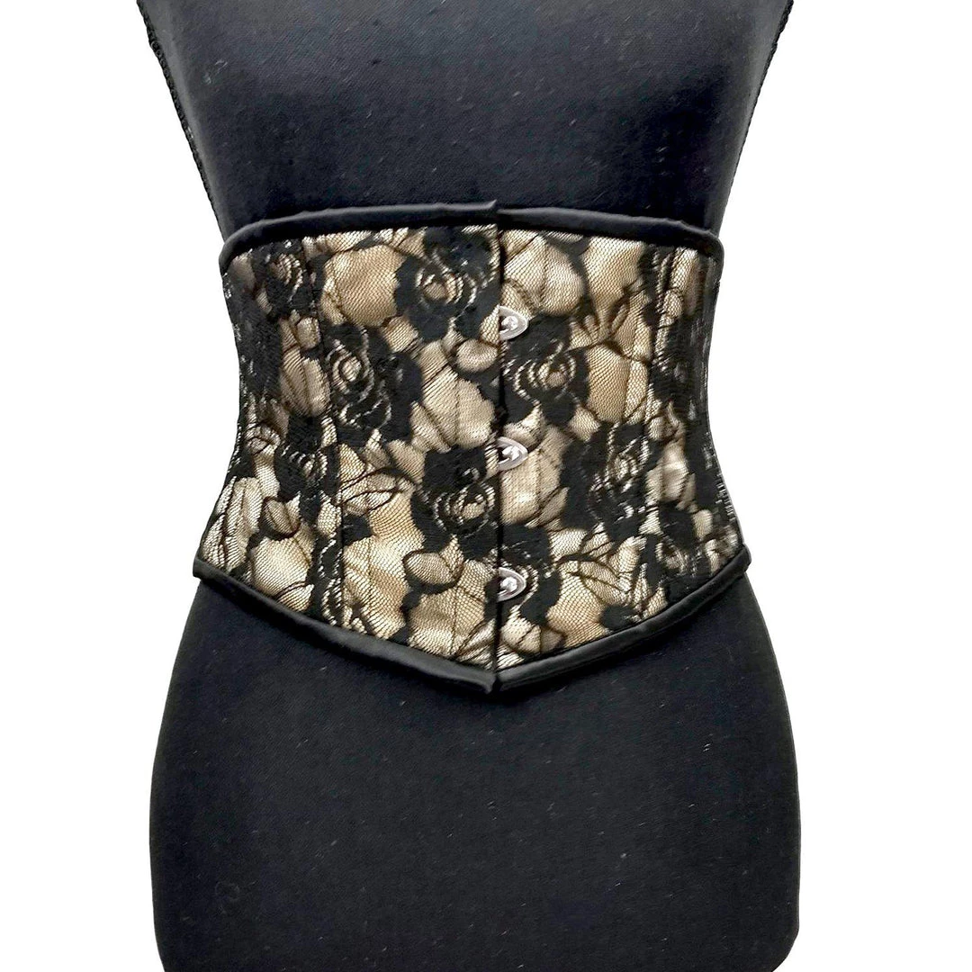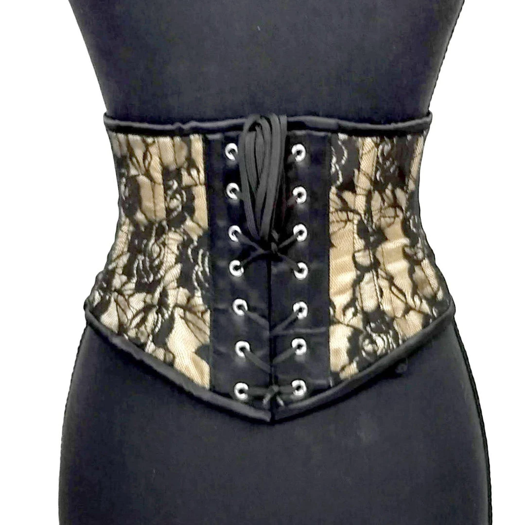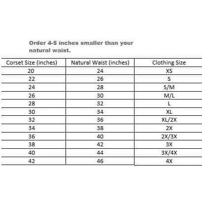 The front is 7″ long, it has a stainless steel busk, laced back, modesty panel, and a combination of 20 flat and spiral steel bones. Brings your waist in for a 3” to 4″ (or more!) reduction.