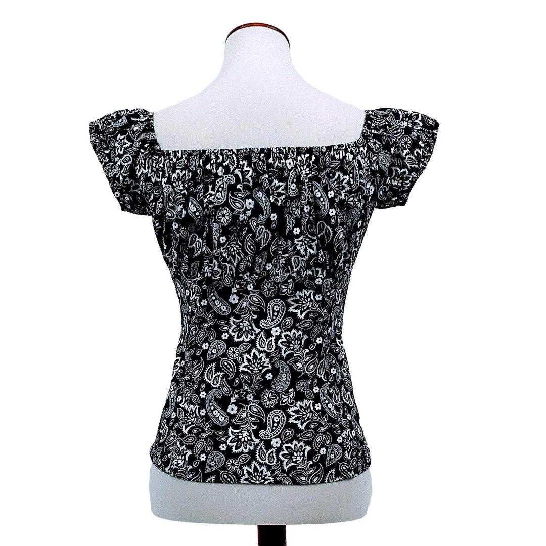 A peasant blouse is a PERFECT addition to any pinup outfit with its simple, classy look. Pair it with your favorite capris, pedal pushers, or circle skirt for a romantic retro look. Pretty paisley kerchief print in black and white.