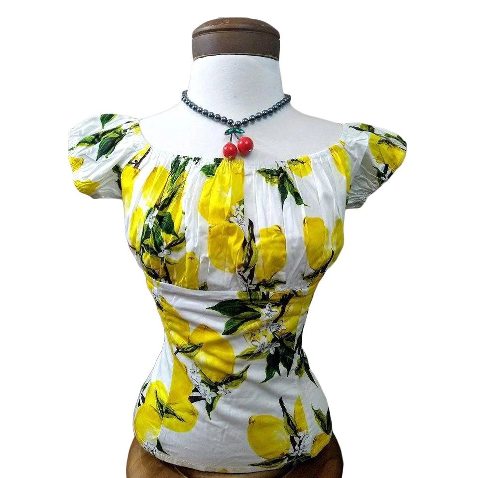 A peasant blouse is a PERFECT addition to any pinup outfit with its simple, classy look. Pair it with your favorite capris, pedal pushers, or circle skirt for a romantic retro look. Yellow Lemons bursting with color!