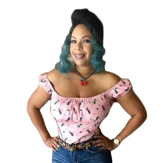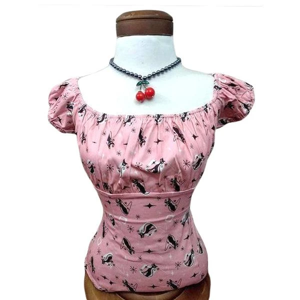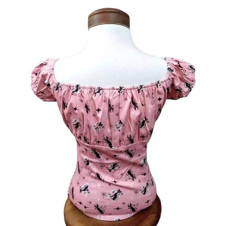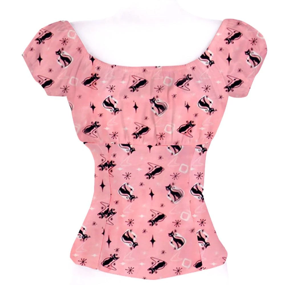 The retro kitty print is a perennial favorite, and a peasant blouse is the PERFECT addition to any pinup outfit with its simple, classy look. Pair it with your favorite jeans, capris, pedal pushers, or circle skirt for a fabulously fun retro look.