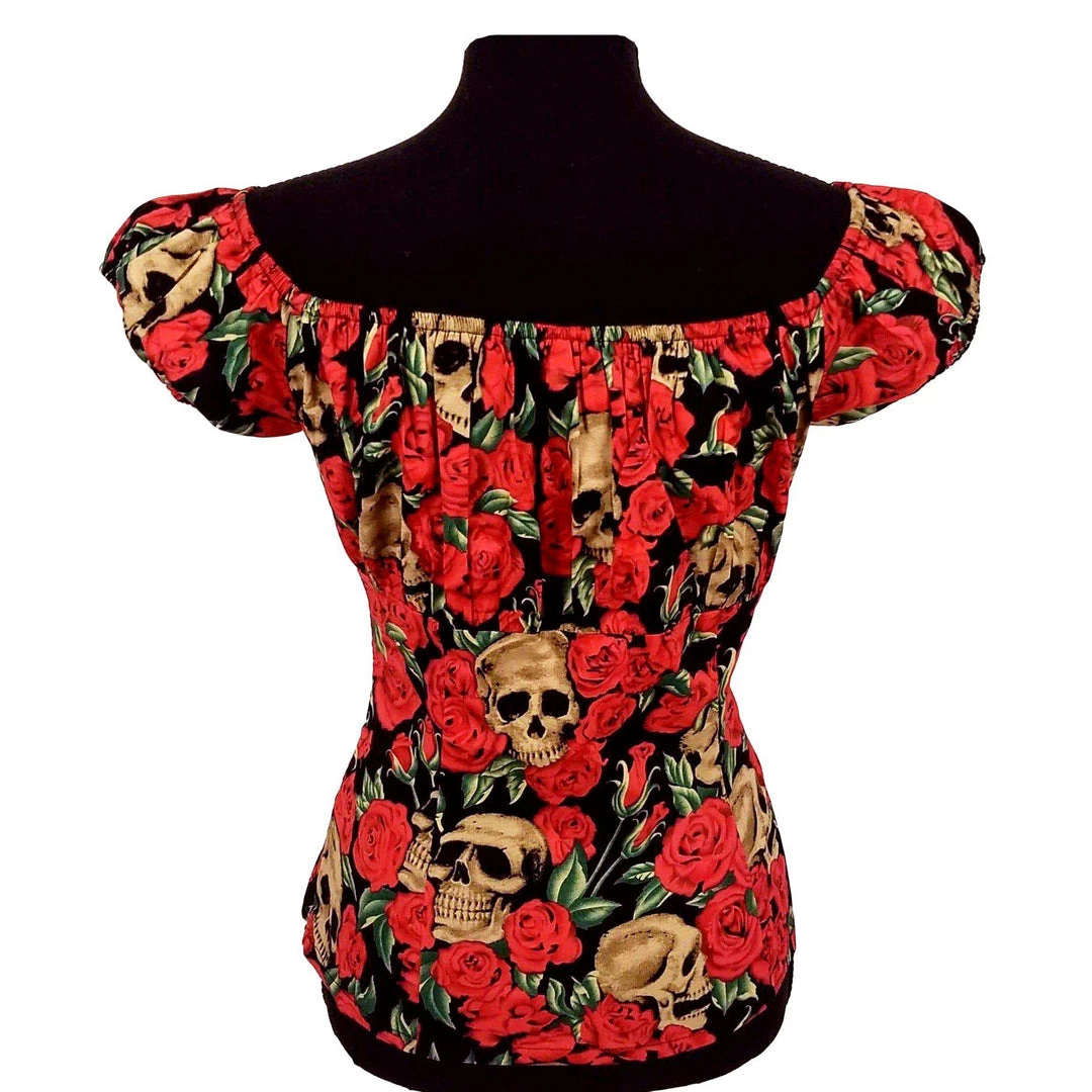 This fabulous skulls and roses print peasant blouse is the PERFECT addition to any pinup outfit with its classic rockabilly look. Pair it with your favorite jeans, capris, pedal pushers, or circle skirt for a fabulously fun retro look.