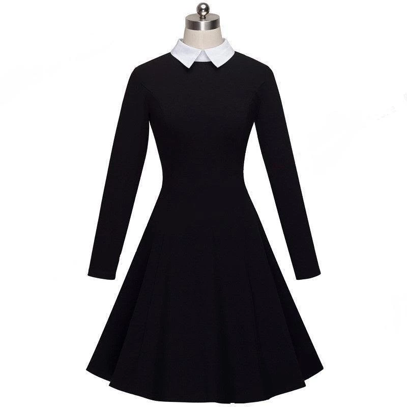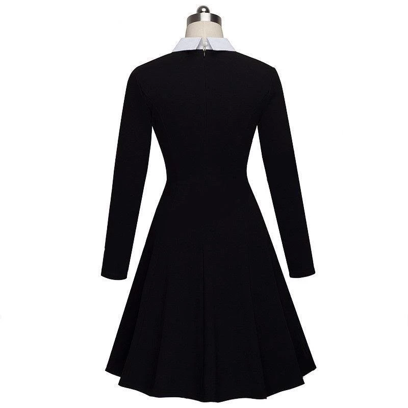 Watch out she is cute but dangerous. This lightweight A-line dress is black with long sleeves, and a white pointed collar giving it a simply cute and sassy white-collar look with a skater skirt flare. It zips up the back with button closure on the back of the collar.