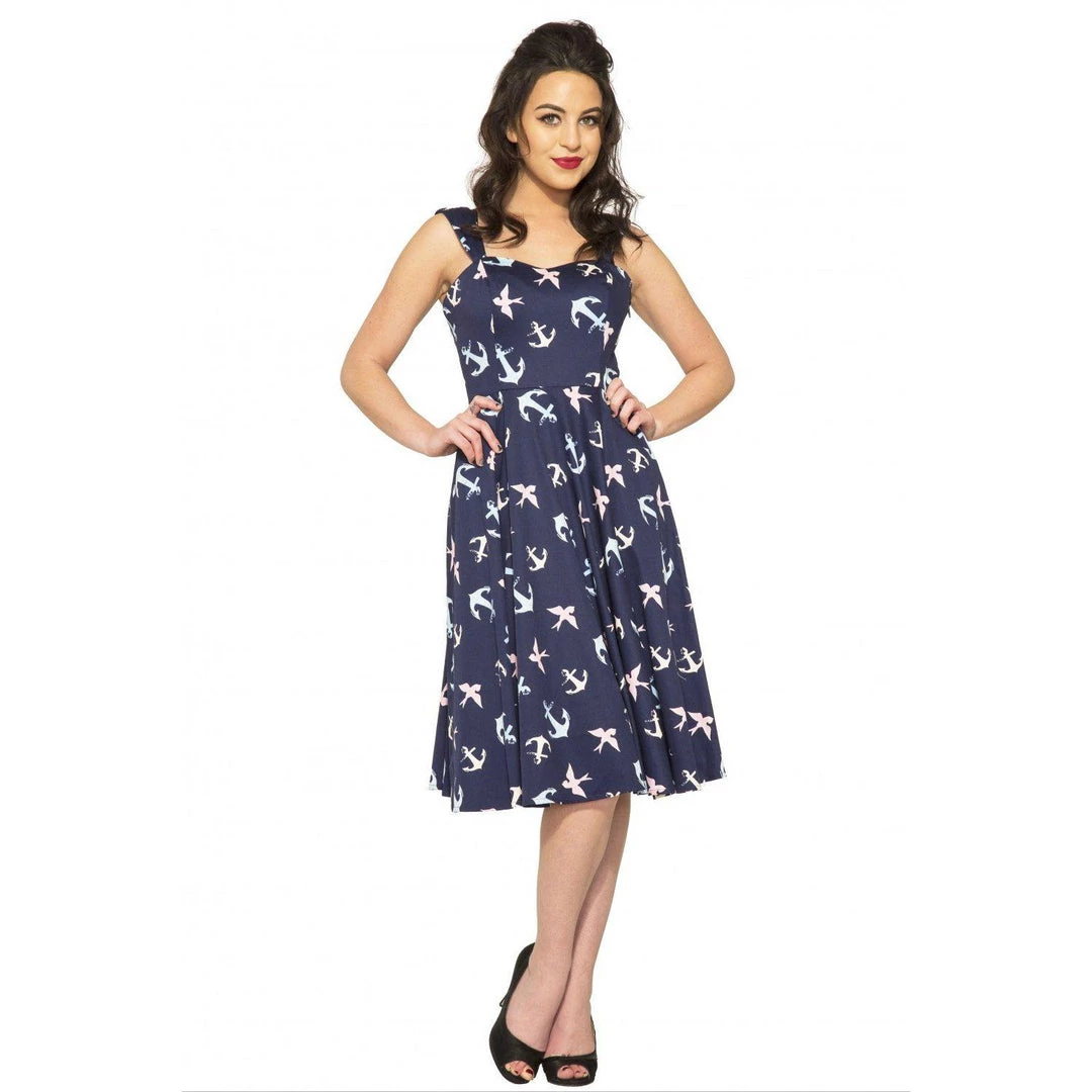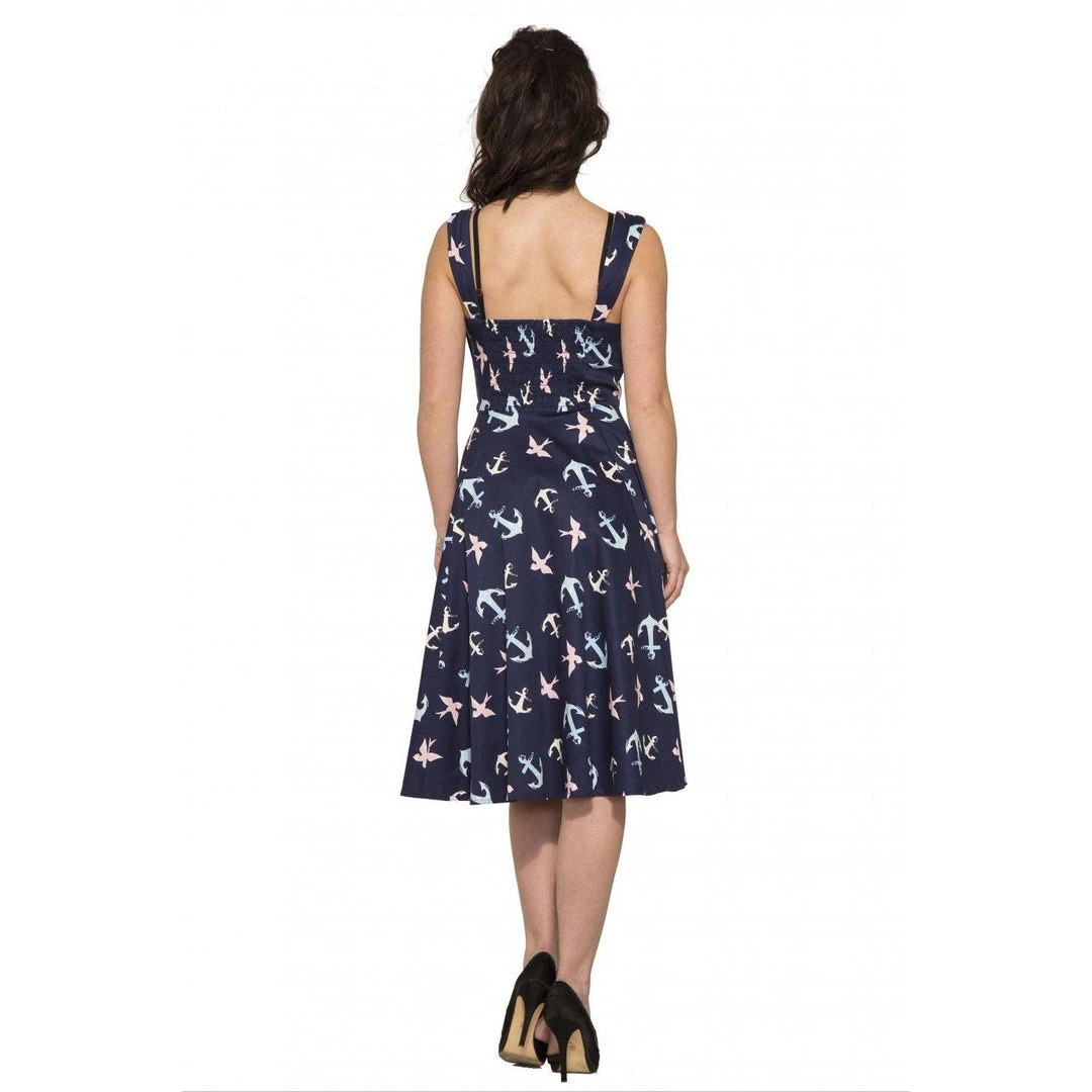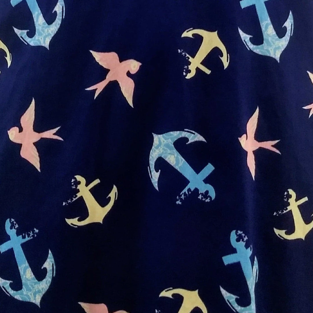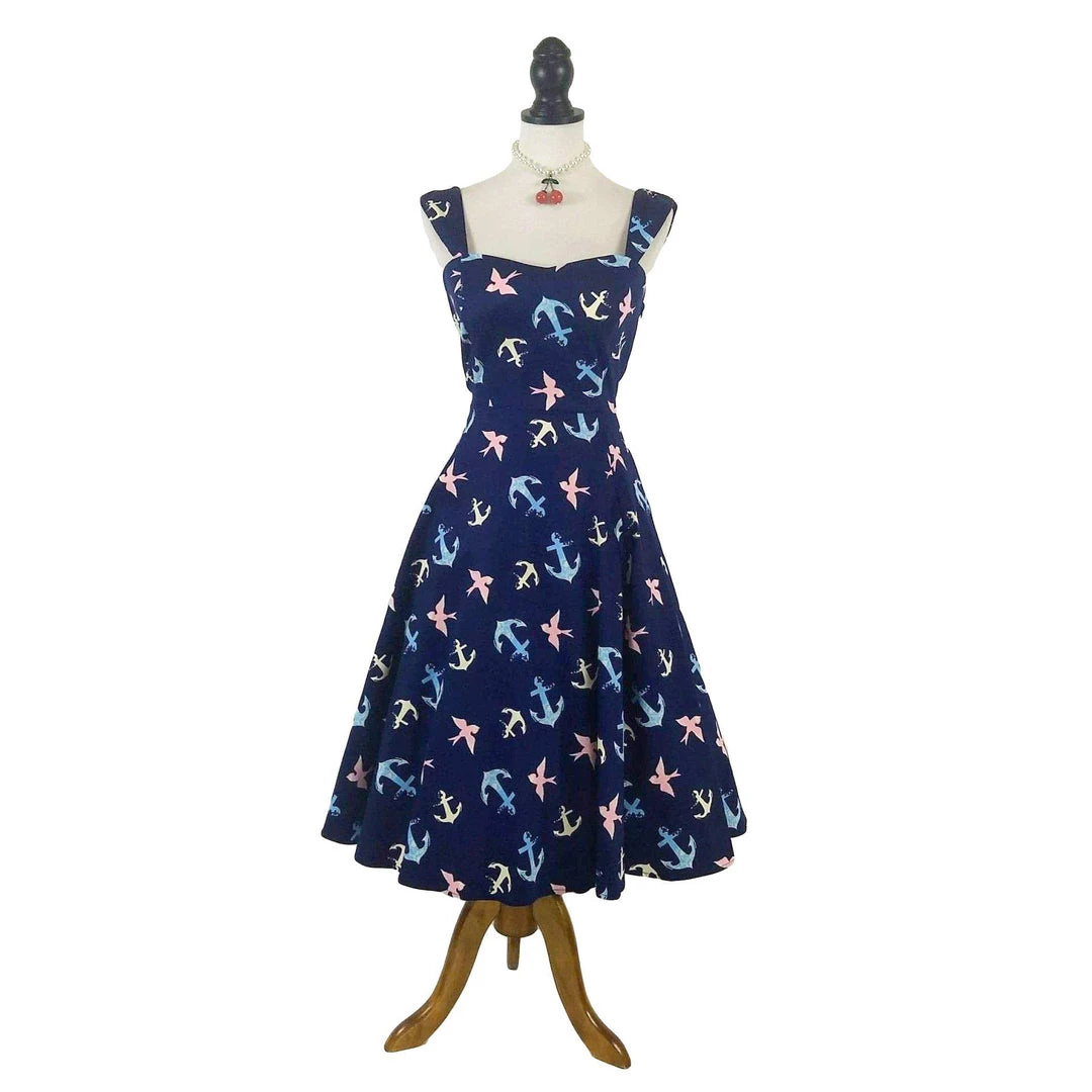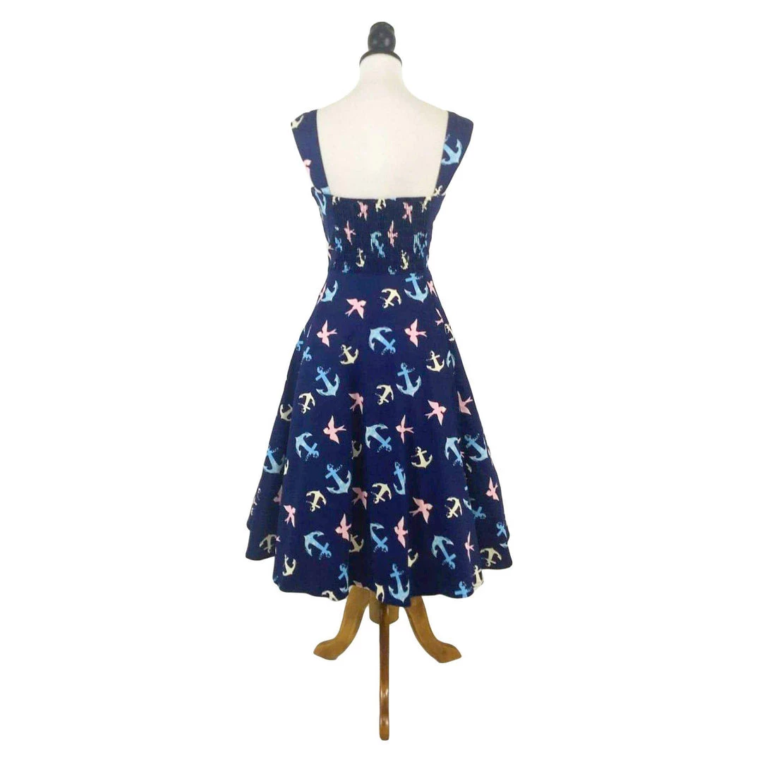 This lovely sundress in ocean blue will transport you to the seven seas! Made of cool, comfy cotton, the exclusive H&R London Sunken Swallows print conjures a retro marine style just right for any outing. It has wide straps, a sweetheart neckline, and a flattering princess-seamed bodice. Elasticized back gives it a super comfortable fit. Zips up the side.