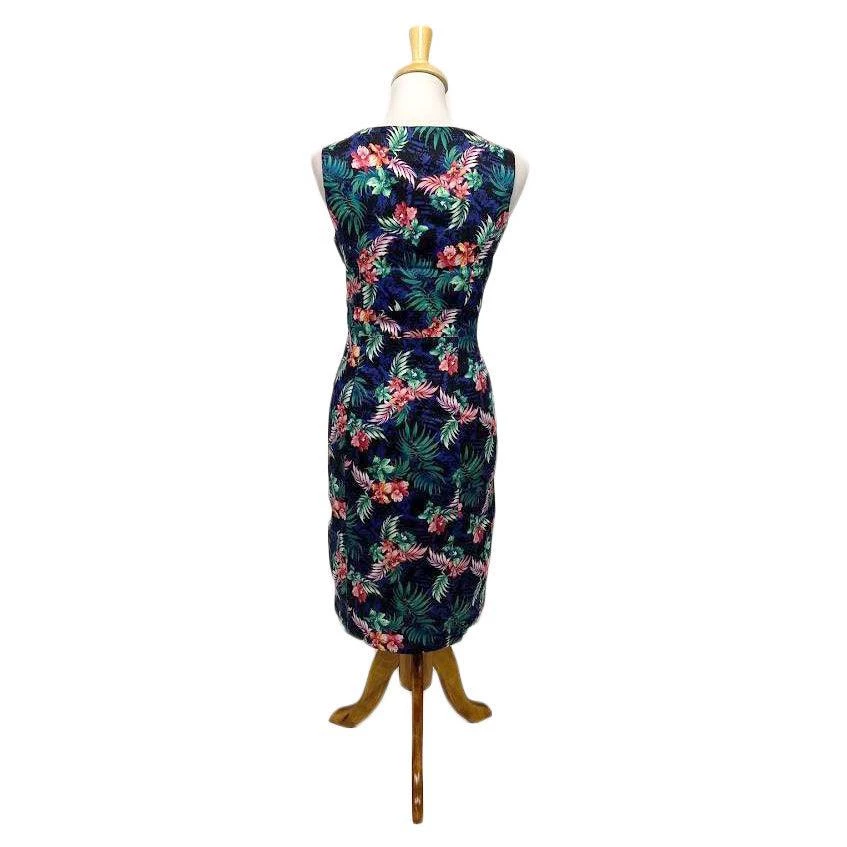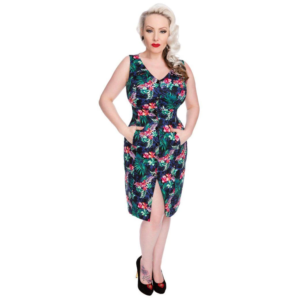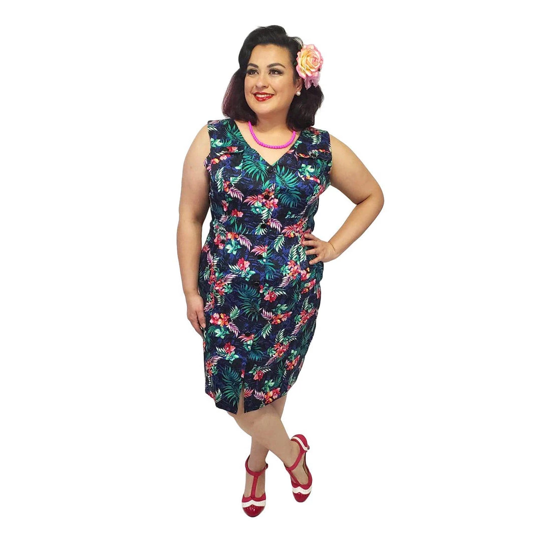 Take a ride on the wild side in this Tropical Safari wiggle dress made from a soft and stretchy cotton blend. This number buttons from top to bottom and features a V-neckline and a peek-a-boo front hemline. Functional pockets on each shoulder open and close with shiny black buttons, and there are slash pockets on the front skirt, as well. The fabric is super stretchy and can accommodate nearly an inch over the stated measurements.