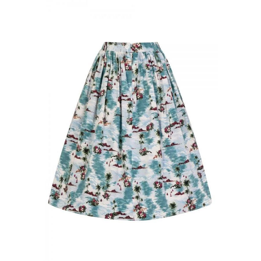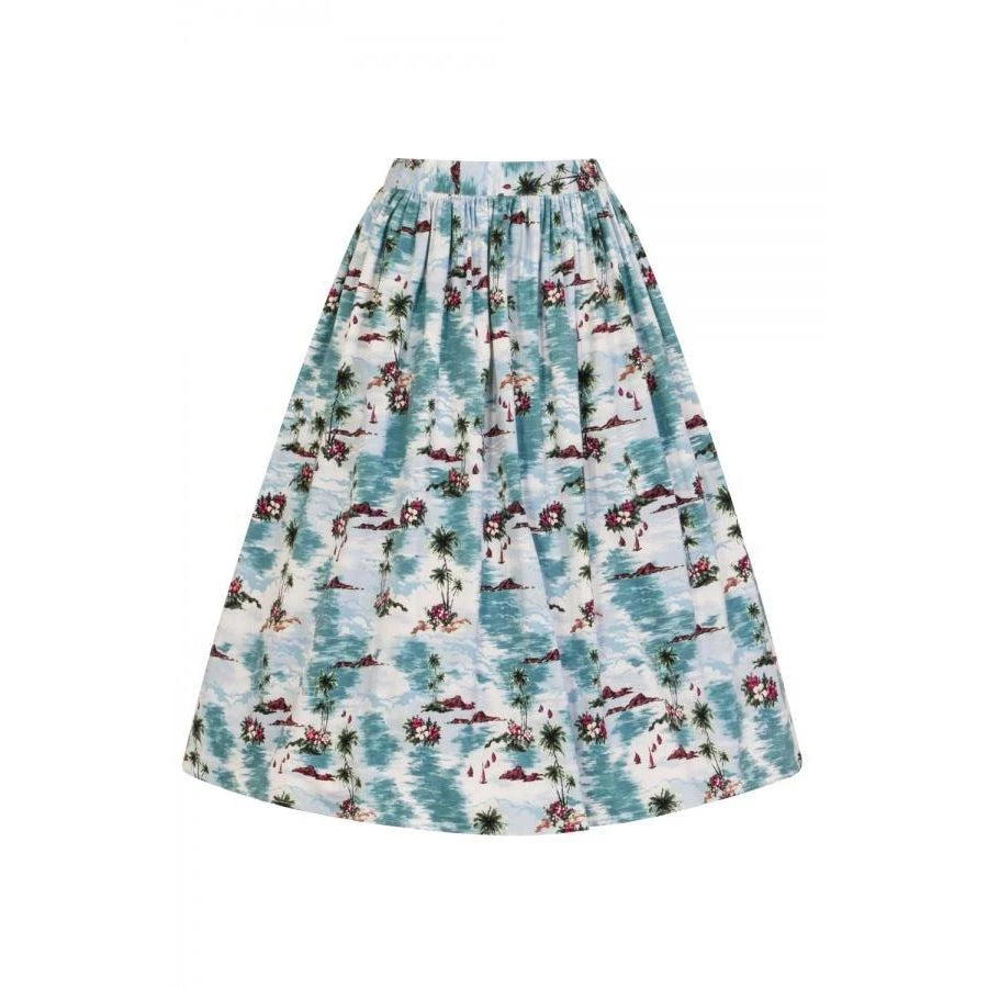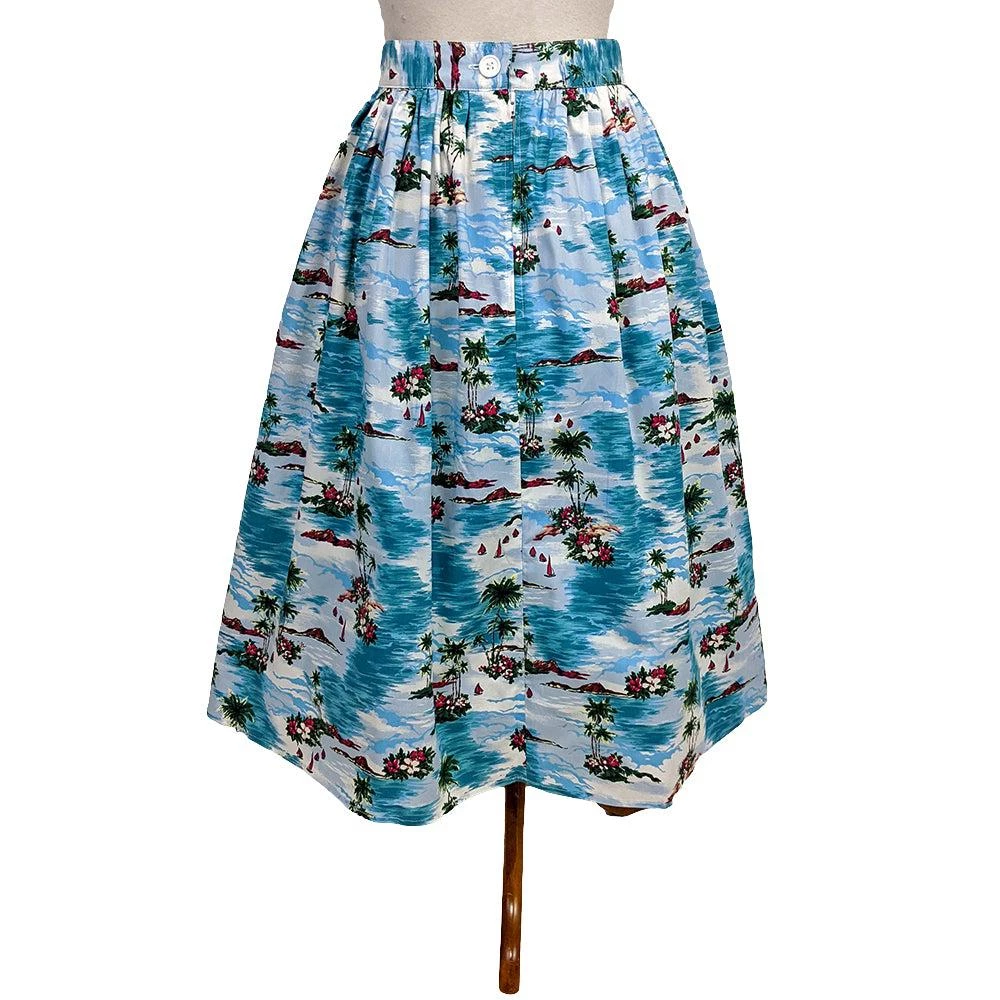 Aloha beaches! This skirt is light blue and white with a stunning artwork print of tropical islands and volcanos on the sea. This full circle skirt is gathered at the waist and has side pockets. There is a hidden zipper and button in the back.