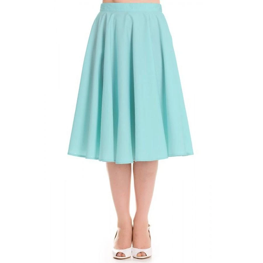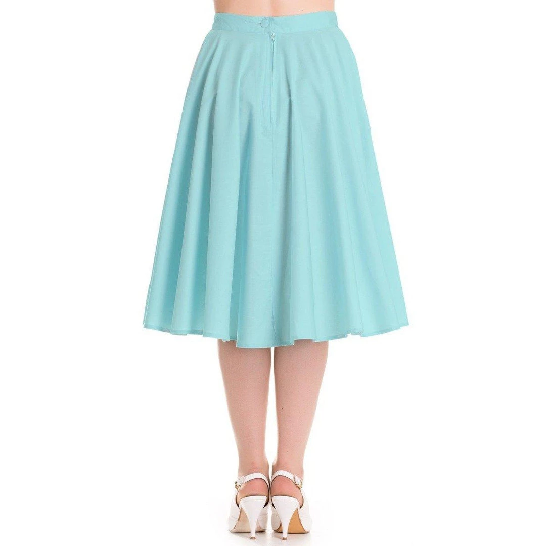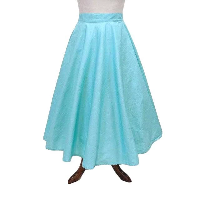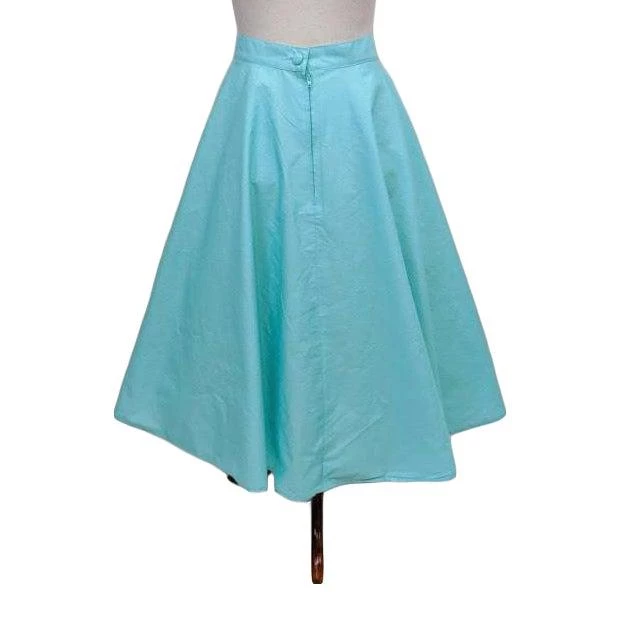 Swing out in fabulous 50’s style wearing this circle skirt in cool aqua blue. It is lightly gathered onto the waistband, zips up the back, and closes on the waistband with a fabric-covered button. Â