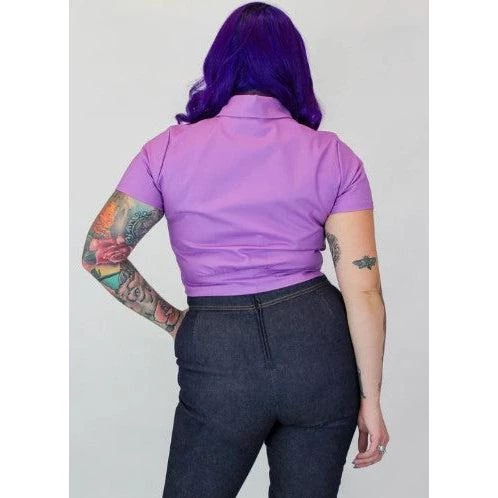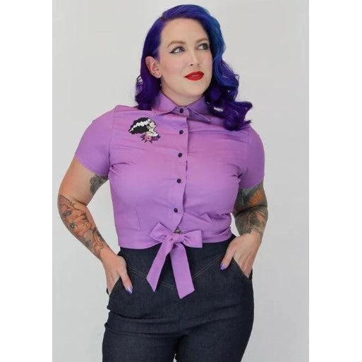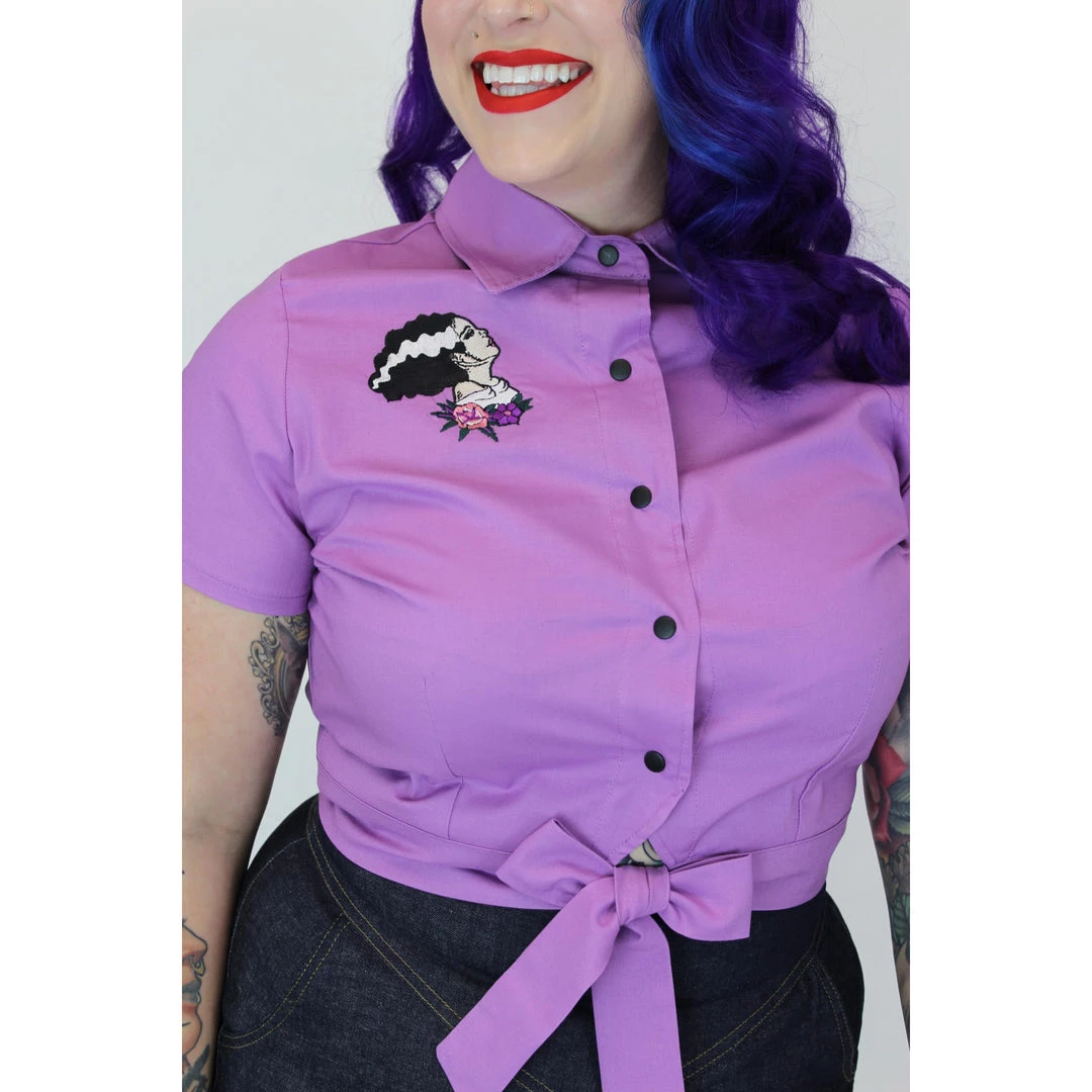 This fabulous knotted-waist blouse from Hemet is the perfect topper for your high waist capris and retro circle skirts. The lovely lavender top has an amazing Bride of Frankenstein embroidered on the right chest, and it features a fold-over collar, short sleeves, and straps to tie into a bow at the front. The snap-up closure makes it easy to dress and easy to style by snapping all snaps or leaving one or two open. Â