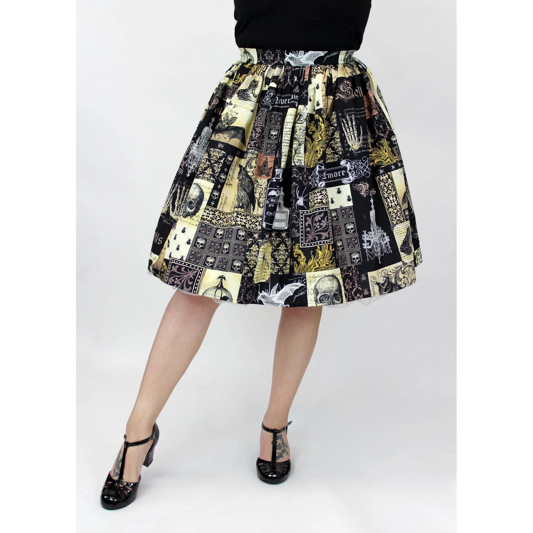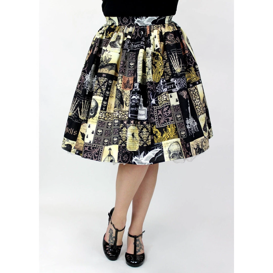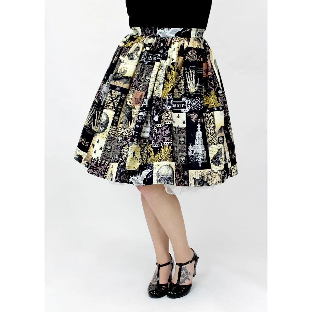 This adorable lightweight circle skirt from Hemet is creepy fun! The skirt features an intriguing print with images from Poe’s writings. It is a full gathered skirt with a back zipper closure. Pair it with knot tops, cropped tops, or pin-up blouses, and add a petticoat for a show-stopping look.