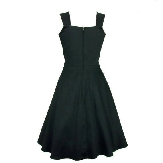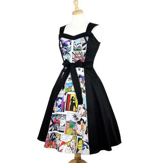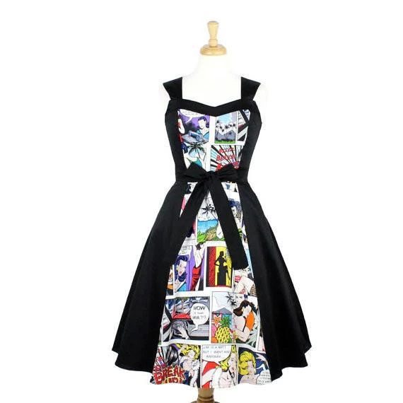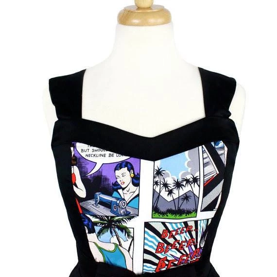 This stunning sleeveless dress features a fun and colorful retro comic strip pattern, with black panels to the sides of the garments for a slimming colorblock effect. The fitted bodice and full circle skirt give it a super flattering shape for any figure. Fully lined top, full back zipper, knee length skirt. Made in the USA