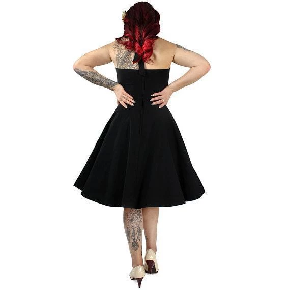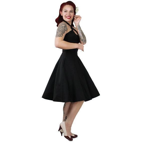 Stop traffic (not literally, please!) with this stretchy halter circle dress from Hemet! The ties criss-cross in the front and tie at the back of the neck, making this twirly little black dress anything but basic. Dress has a back zip AND POCKETS! Made in the USA.