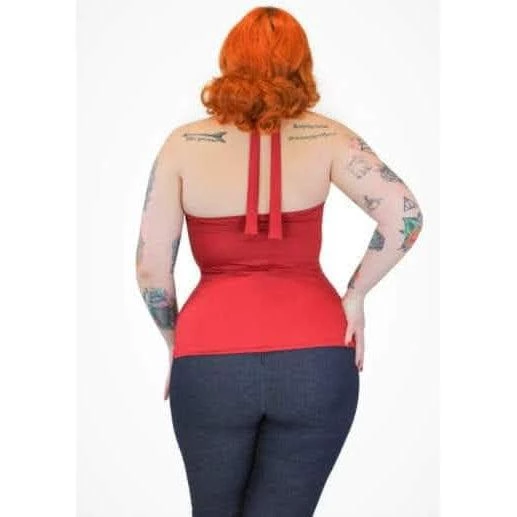This adorable criss-cross halter top in lipstick red is a fun & edgy addition to your retro wardrobe! The length on the blouse is perfect to tuck under high waist capris, jeans, or cigarette pants, and full circle skirts. It has a straight hem if you wish to wear it on the outside. It features two lightweight straps on the front to tie around the neck, and is super stretchy to show off your silhouette. Made in the USA.