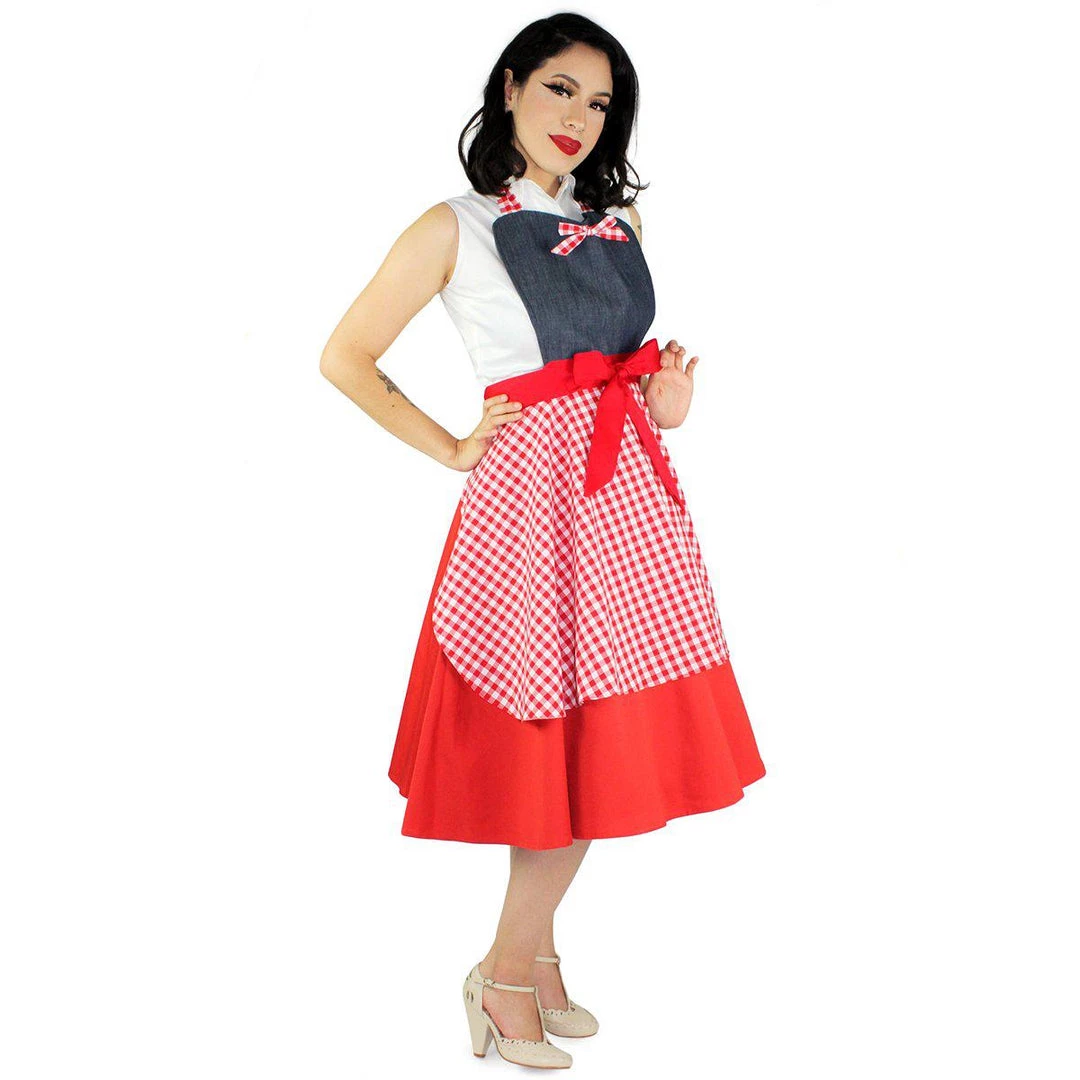 The apron features denim-like fabric at the top, red and white gingham at the bottom, and a sweet gingham bow at the neck.