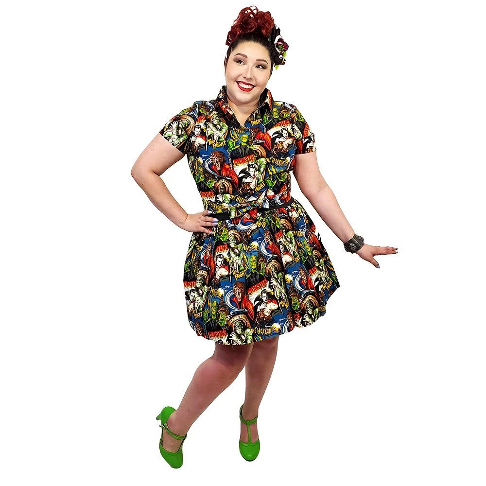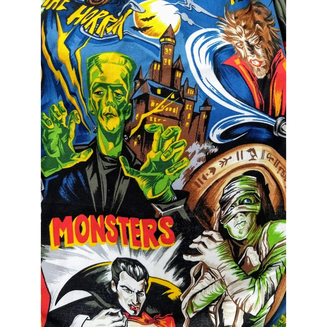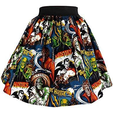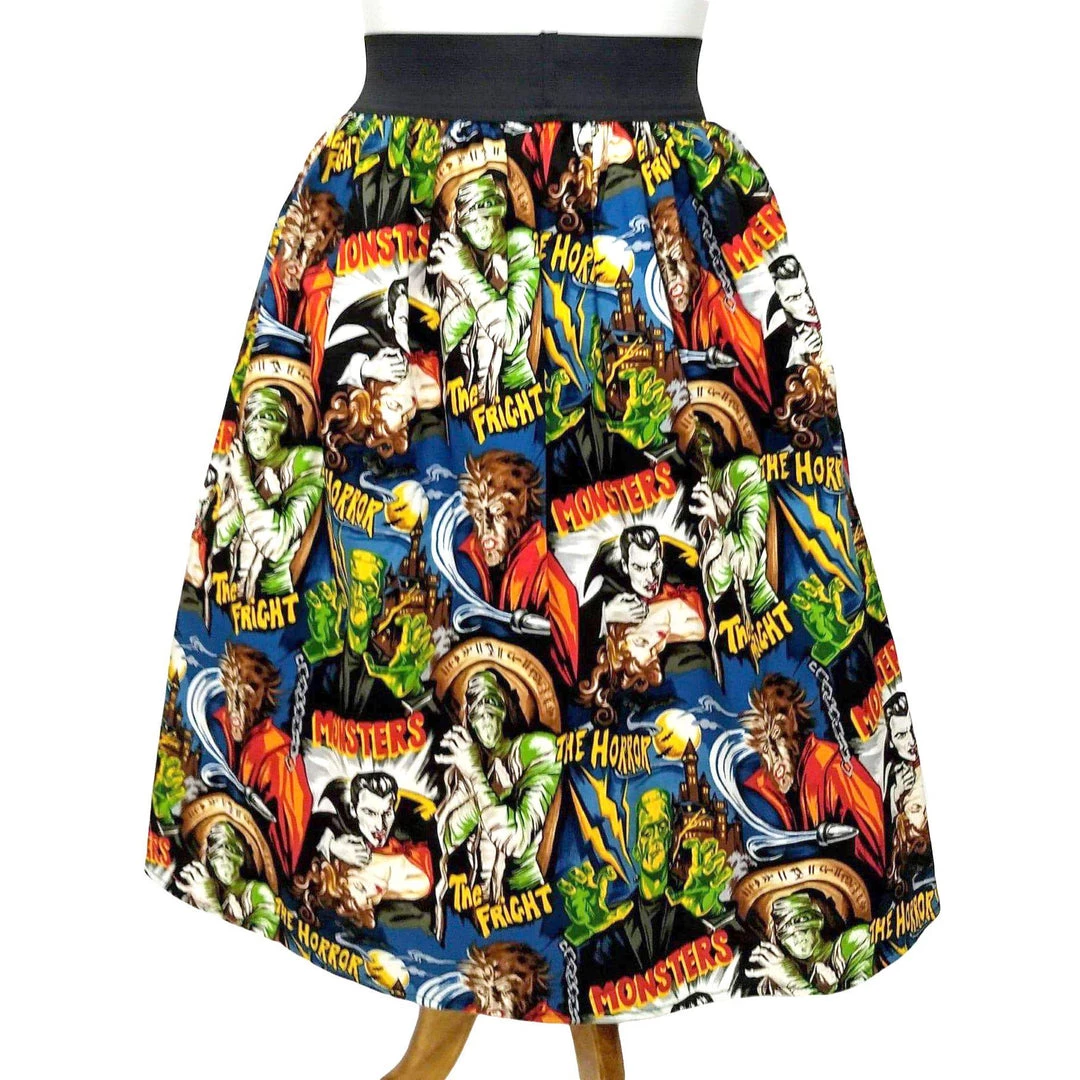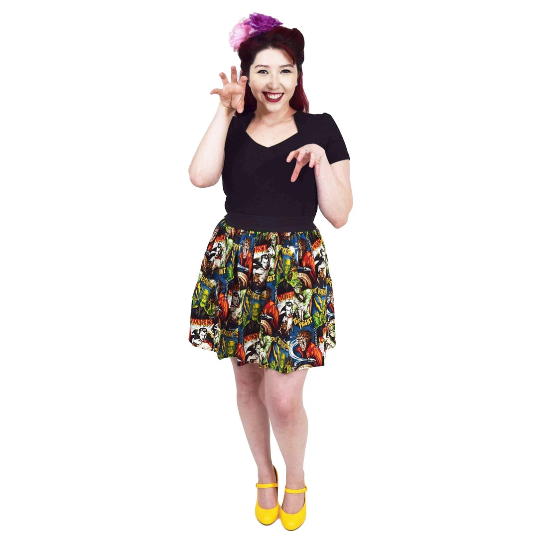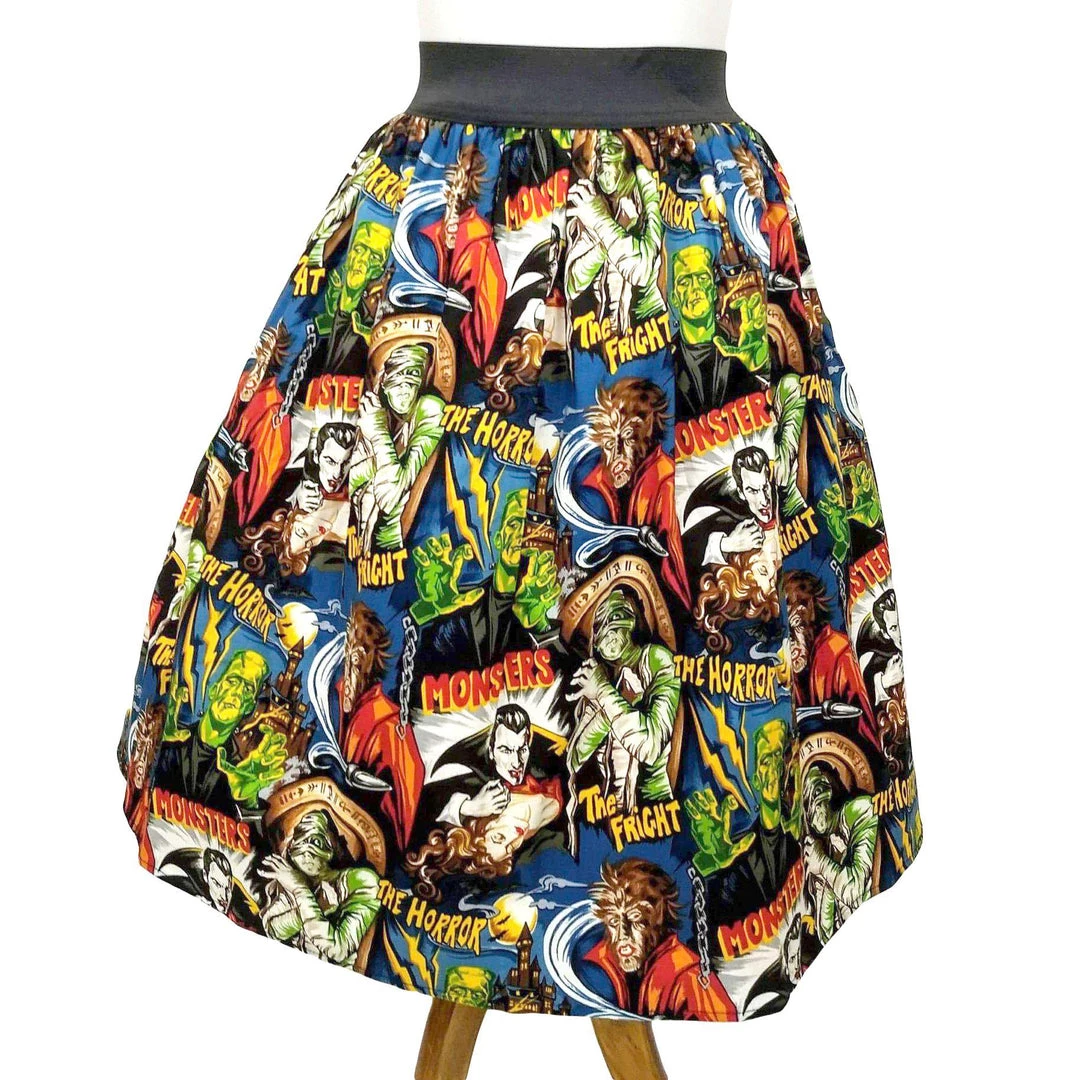 “She did the mash… She did the monster mash!!” This super killer gathered skater skirt is adorned with classic horror characters to make any pinup girl’s closet a scream!  The wide elastic waistband has incredible stretch for a very accommodating fit.Â
