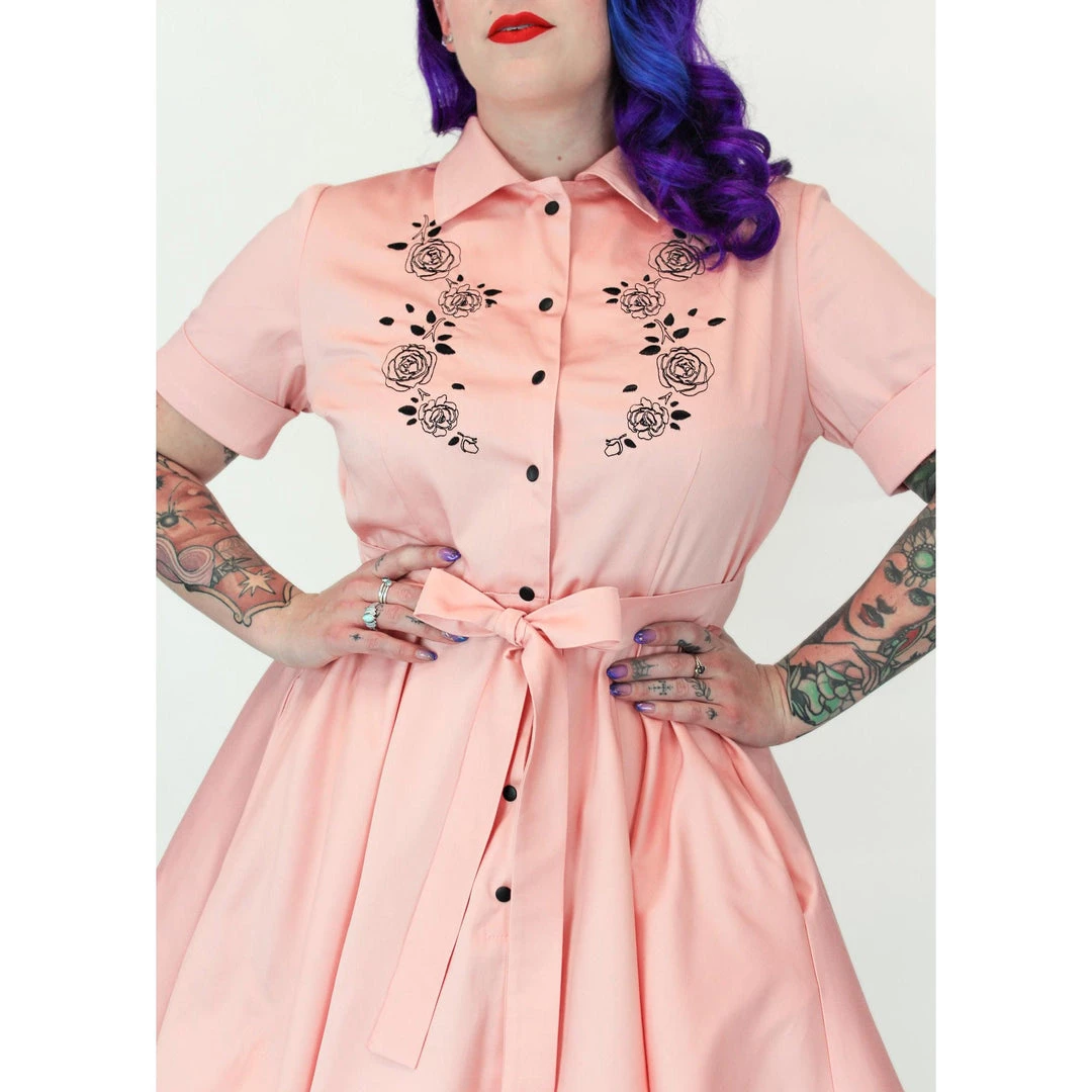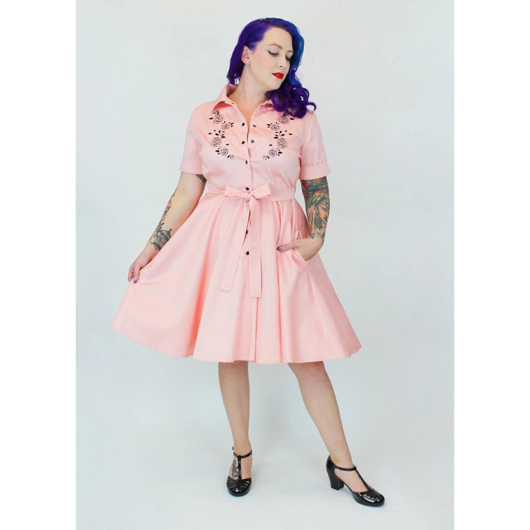 Step into the 1950s in this lovely pink dress from Hemet. Appropriate to wear to both casual and formal events, this short-sleeved dress features a darted bodice that has roses beautifully embroidered in black down the front of the chest. The dress snaps up the front with black snaps and has side seam pockets in a full circle skirt.  An attached belt cinches the waist.