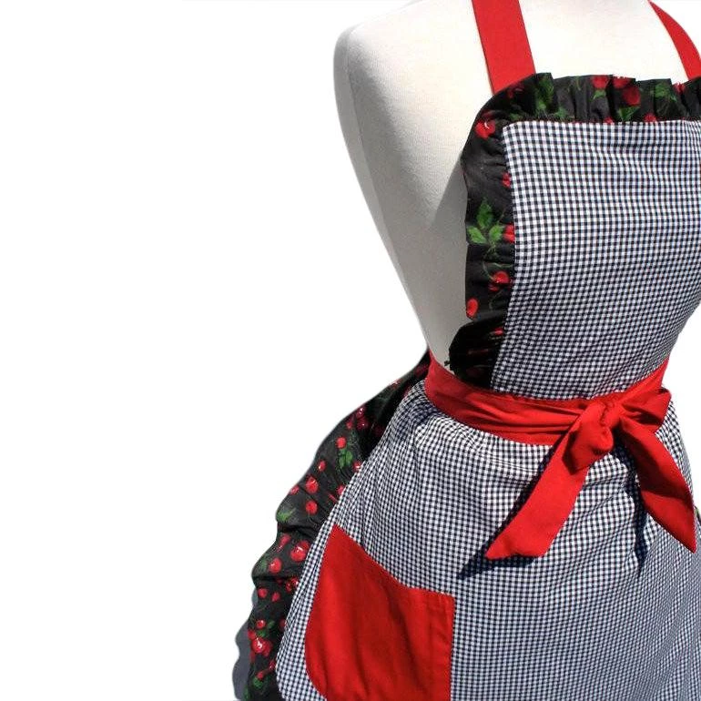This super cute apron would make a perfect a gift for someone who loves to look fabulous while cooking – or for yourself, we won’t tell! It features a classic black and white gingham framed by a retro cherry ruffle and cherry red trim. Lengthy straps around the neck and waist make this apron amazingly adjustable. Tie at the back or wrap around to the front to make a sweet bow.