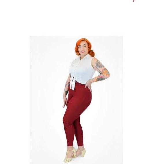 Inspired by the popular pants of the 1930s, 40s, and 50s, these high waist cigarette pants in burgundy are oh so retro!   This essential piece hugs your body to show off your silhouette and stretches just enough for ultimate comfort. The back zipper makes for easy wear. Styled up or down, this is a perfect staple to pair with any cute blouse for work or with a crop top for a day out on the town.