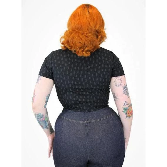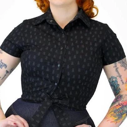 This adorable cat print knot blouse is the perfect topper for your high waist capris and fab retro circle skirts. It features a fold over collar, short sleeves, and straps to tie into a bow at the front. The snap up closure makes it easy to dress and easy to style by snapping all snaps or leaving one or two open. Made in the USA.