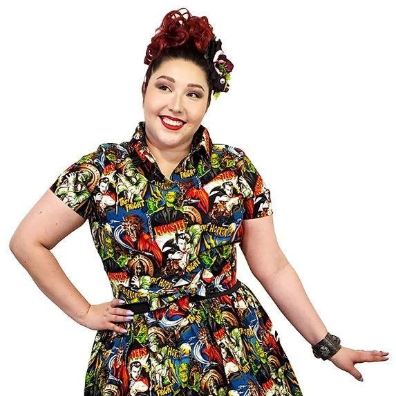 This adorable ’50s-inspired knotted blouse will make any pinup girl’s closet a scream. It features a peter pan collar, short sleeves, and straps to tie into a bow at the front, all in a fun classic horror character print! Enjoy the rare fabric by Robert Kaufman featuring Frankenstein, Wolfman, Dracula, and The Mummy. The snap up closure makes it easy to dress and easy to style by snapping all snaps or leaving one or two open. Made in the USA.
