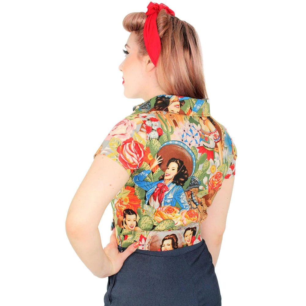 This adorable ’50s-inspired knotted blouse is the perfect topper for your high waist capris and fab retro circle skirts. It features a peter pan collar, short sleeves, and straps to tie into a bow at the front, in a fun southwestern print. The snap up closure makes it easy to dress and easy to style by snapping all snaps or leaving one or two open. Made in the USA.